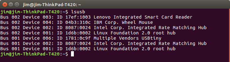 After flashing we need to set the configuration fuses, which is done by entering make fuses on the terminal. This will set up all of the fuses except the one that disables the reset pin. Next we need to check the USB connectivity. This is done by typing lsusb in the terminal, which will list USB devices. And if we should see a "Multiple Vendors USBtiny" device, it worked correctly, and it did work for me right first time itself.