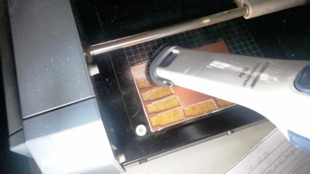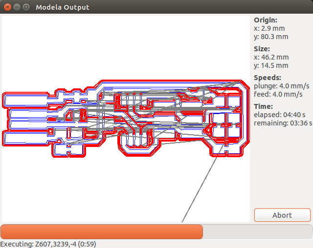 Select the ‘PCB traces’ option under the ‘process’ drop down. Adjust the cut depth to 0.1mm, which will mill away the copper. Then select the ‘calculate’ option.This will generate the tool path for the device.Go through the tool paths and see if all traces are available. It is interesting to note that if we give -1 as the offset value, then all the copper except the traces will be removed. Finally click the ‘send’ button to send the tool path to the device. And it will start cutting. A status window will be displayed, showing the time elapsed and remaining, and mine took about 10mins to mill the traces.