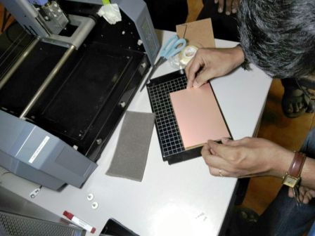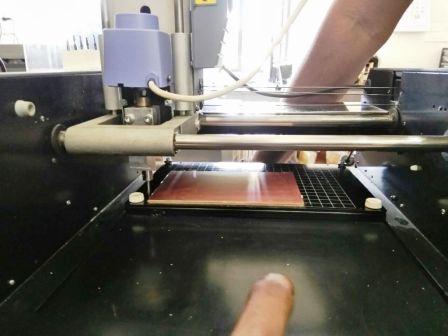A PCB board of suitable size could be fixed on the sacrficial layer using double side tape. Care should be taken to evenly place the board, as any variations may cause cutting tool breakage. If the milling surface is not level then need to apply pressure gently on the raised areas, if that doesn’t work we need to redo the adhesive part, making sure that its level and uniformly distributed.