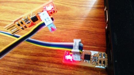 Then we need to connect another programmer, I have used the fabISP made by Ajith in our lab, to load the program to my fabISP. The Red LED will glow now. It should be noted that the boards are oriented in the same direction. Then we need to enter make flash on the terminal. This will erase the target chip, and program its flash memory with the contents of the .hex file we built before. We should see several progress bars while avrdude erases, programs, and verifies the chip.
