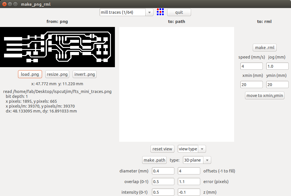 The board layout, need to be available as an image (.png) file, having black and white coloring. The black portion of the board is removed by the miller and the white portion remains as the circuit trace. The layout used for this assignments are available here.