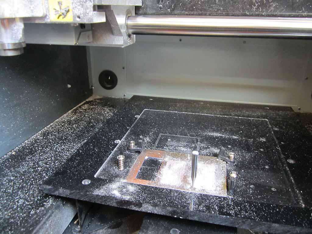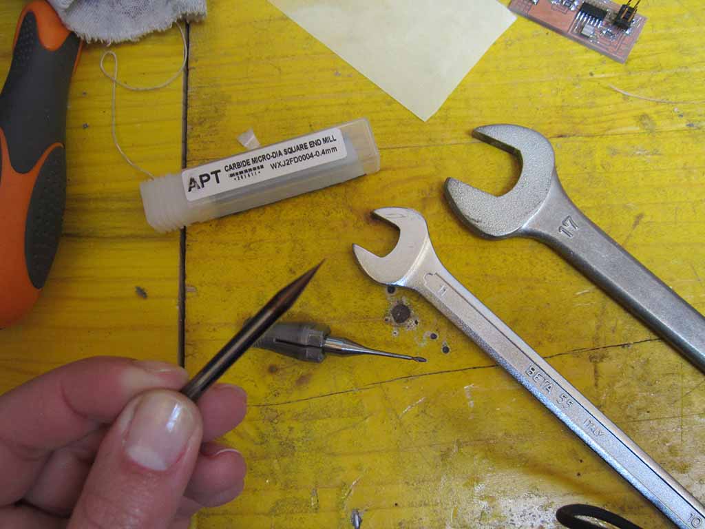 The machine started to move to the origin and the mill started to go down, down and... too late! I forgot to reset the Z origin after having changed the endmill: since the new tool was taller, the Z axis messed up. So the tip of the tool punctured the plate and stuck into the table (Fig. 13).