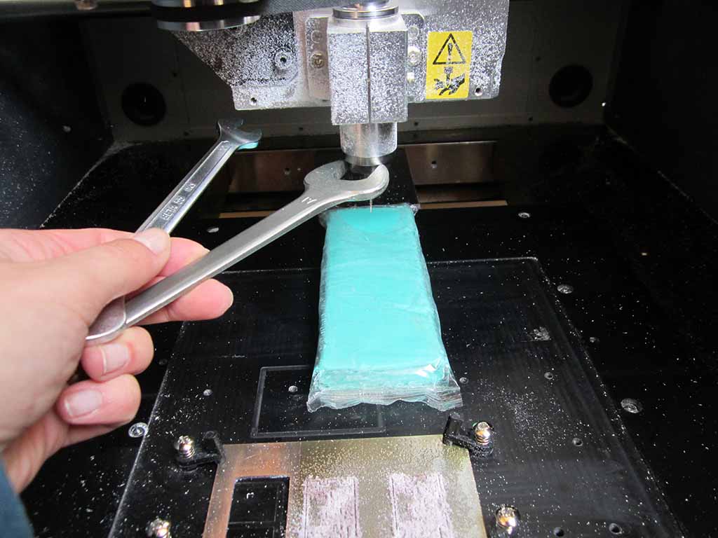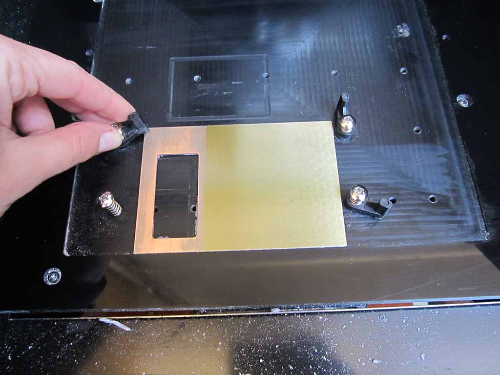 Then I fixed the copper plate on the mill table using double-sided tape (Fig. 3 and 4), and I changed the endmill putting a piece of rubber under the spindle to save the endmill in case it falls down (Fig. 5).