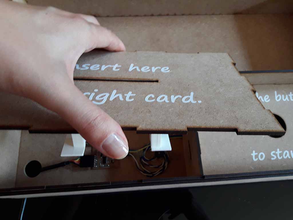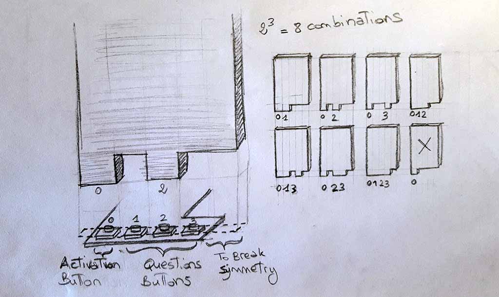 Initially I thought to have four buttons centered on the Card hole to have sixteen combinations. But there was a symmetry problem: the same Card activated two combinations if inserted in both way. To avoid this problem, I thought to put an activation button. But to have only a Card responding to a single combination, I also decentred the four buttons: if the Card space is divides into five parts, you have the activation button at one extreme, one empty space to the other, and the three buttons in the centre. Figure 14 shows this.