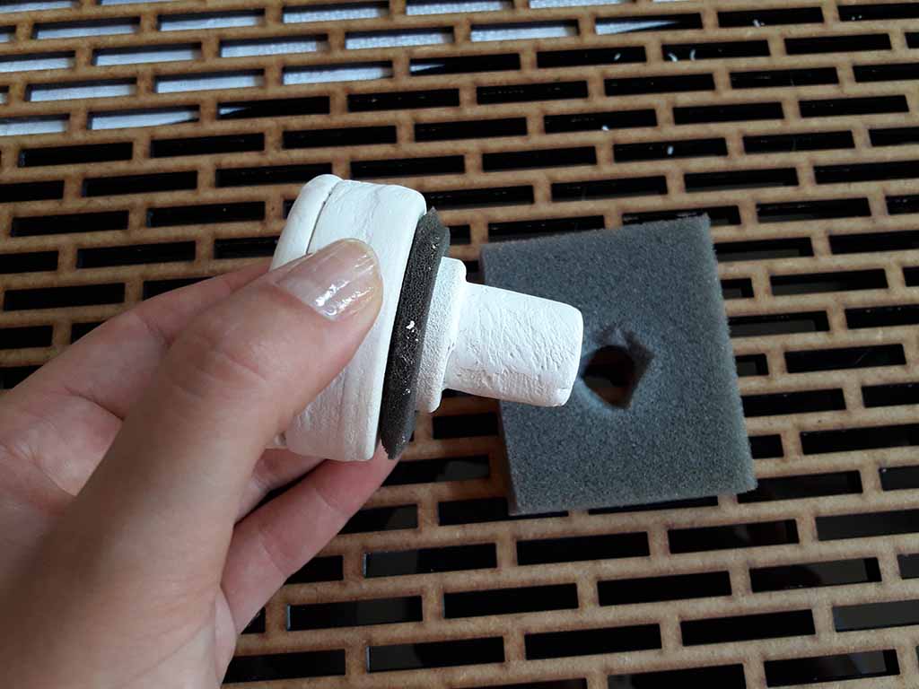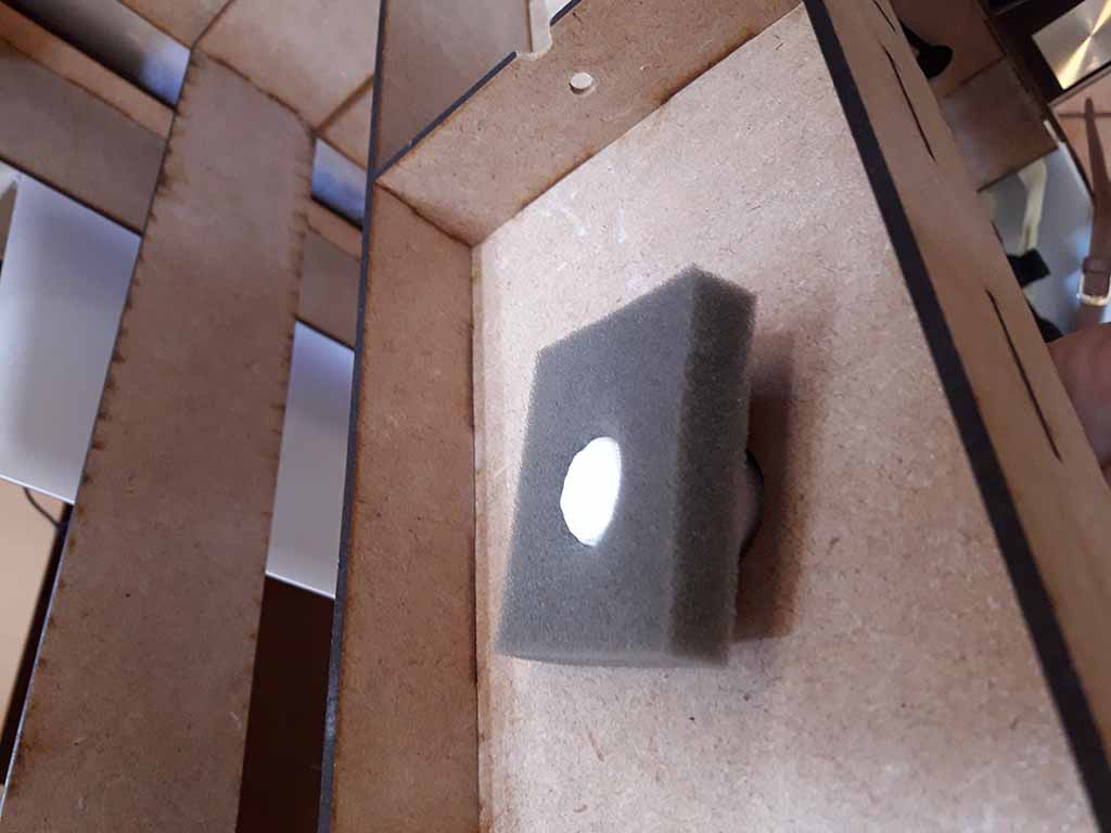 Then I put a piece of sponge around the main button (Fig. 33)to have something like a spring but more soft. I fixed the button at the playwood using another piece of sponge (Fig. 34).
