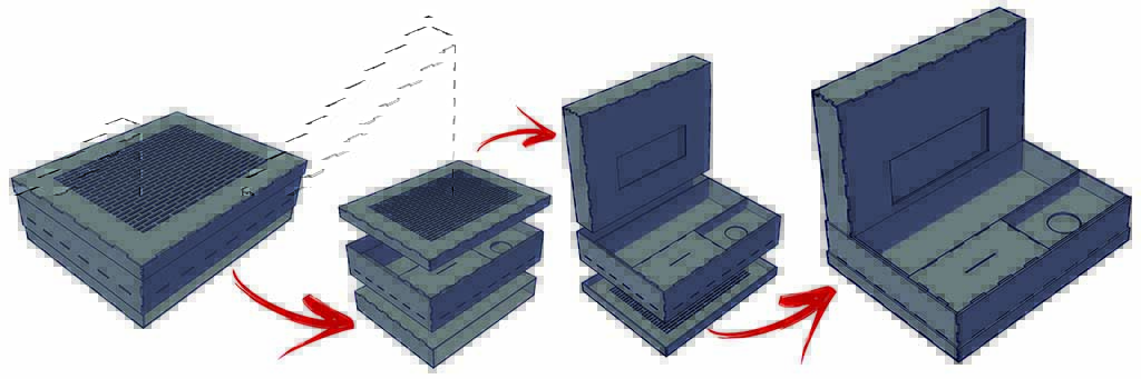 1. The cover of the closed Box becomes the base to support the notebook (it has a grid for the air);