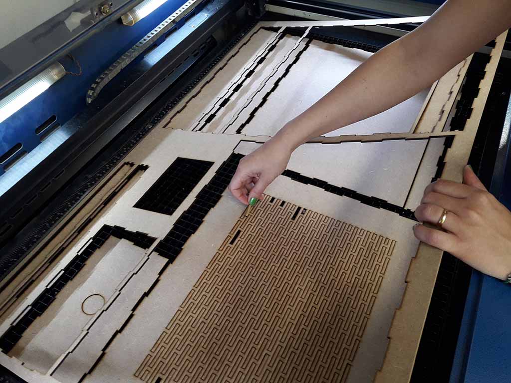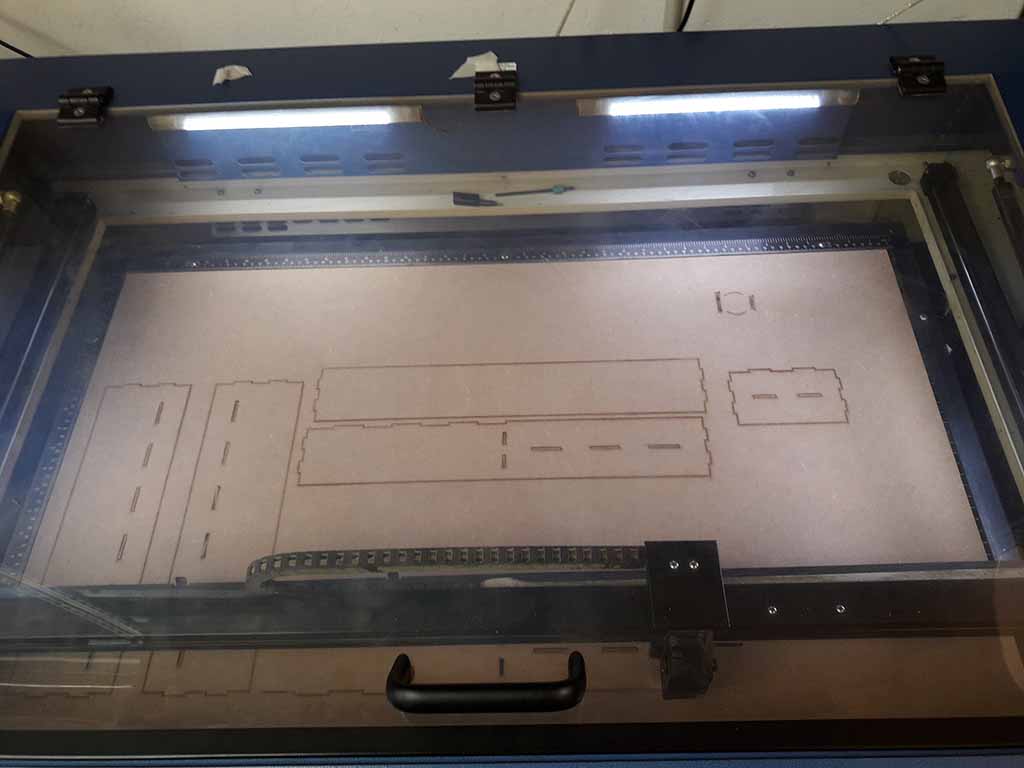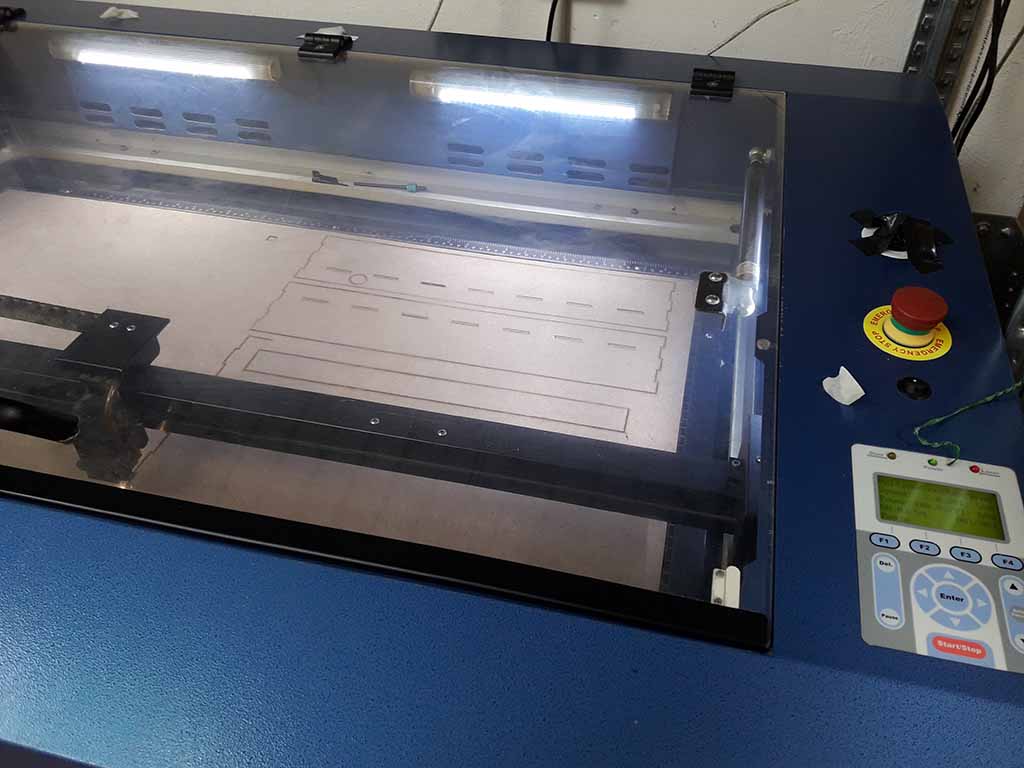 I designed the Box pieces using Autocad (You can download the .dwg file at the bottom of the page) and I laser cut it at Opendot using the GCC SpiritGLS passing through Rhino. To cut the thickness of 3 mm, I used 2,5 for speed and 100 for power. Fortunately I did not have any problems with the laser cutter. In fact, before cutting, I studied the pieces in 3D view and this allowed me to eliminate the errors. To have perfect joints I have increased the thickness of 0.1 mm (the total carve is 0,2 mm). In this way I could assemble the pieces without using glue. Figure 3, 4 and 5 show the laser cutter step. If you want to know more details about laser cutter and How to design through Autocad, you can see my Assignment 3 (Computer-Controlled Cutting).