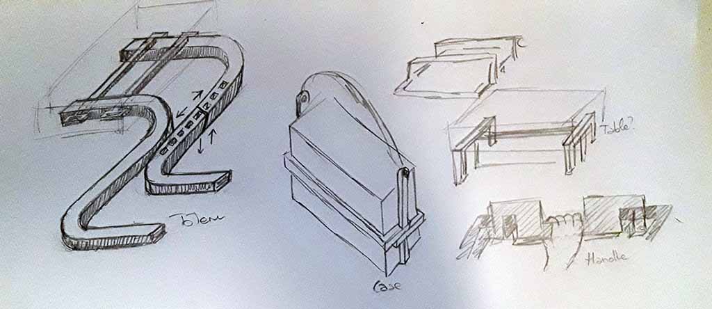 It was more complicated to prepare the Case to carry the Box. I decided to use the CNC machine, but I wanted that the Case could become the Box table. In fact, if the Box is simply putting on a normal table, the base grid becomes useless. Initially I was thinking to make a normal totem, but then I thought about a Case-Table object. You can see my sketches on Figure 6.