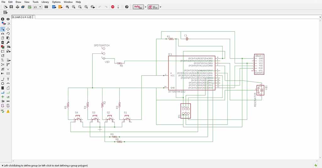 I designed the circuit using Eagle: first the main circuit (Fig. 15), then the circuit for the button that can strat the question (Fig. 16). So I used all the ATtiny44 PINs. I perfected the circuits on CorelDraw (Fig. 17) and prepared the file for the milling machine using the FabModules. I set these parameters on FabModules: