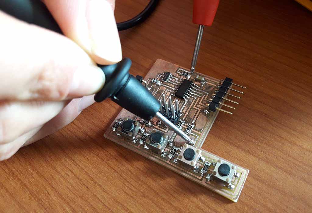 Finally I soldered the components (Fig. 19) and set the fuses (the same of the Hello Board) using my FabISP. Therefore I started to program it. For details about fuses and how to connect the board to the notebook using the FAbISP and the FTDI Cable, you can see my Assignment 8 (Embedded programming) and my Assignment 10 (Output Devices).
