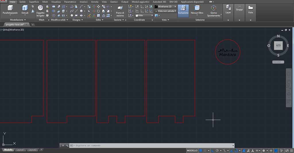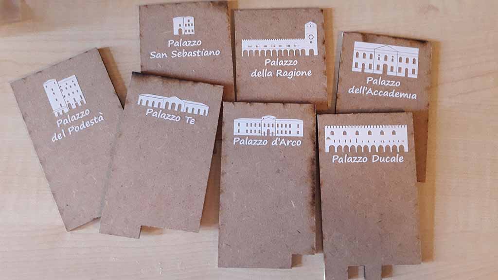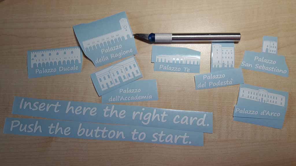 I designed the Cards using Autocad (Fig. 21) and laser cut them using the GCC SpiritGLS again. Together with the Cards I also prepared a circular piece with the topic of the game. I decided to prepare questions and answers about the Mantova palaces, so inside the molded button I put a disk with carved "Mantova" and its skyline. I also laser cut a rectangle of plexiglass to glue it to the Box piece covering the notebook display. I all laser cut pieces into a one .dxf file and you can download it at the bottom of the page. Each cut is a single layer with specified the material. If you want see how I molded and casted the button, you can see my Assignment 12 (Molding and Casting).