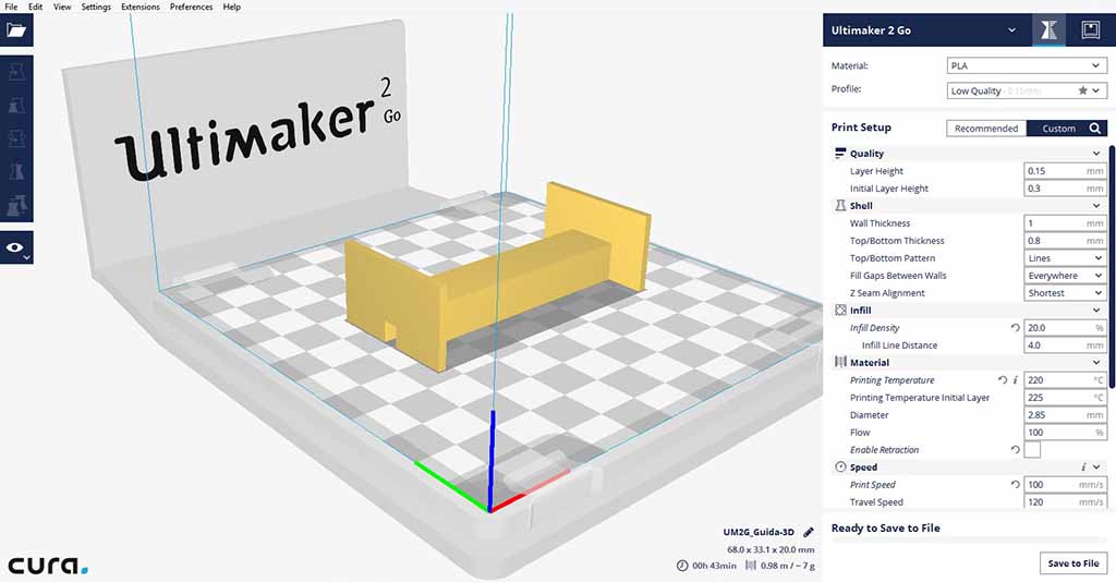 I designed two guide to better insert the Card into the hole. I printed it with 3D printer. I used the Ultimaker 2Go with 0.4 nozzle. To save time I used a layer Height of 0.15 mm and a low Infill of 20% (Fig. 22). I printed the same file two time (Fig. 23). You can see my Assignment 2 (Computer-Aided Design) and my Assignment 5 (3D Scanning and Printing) to know more about 3d design and 3D print.