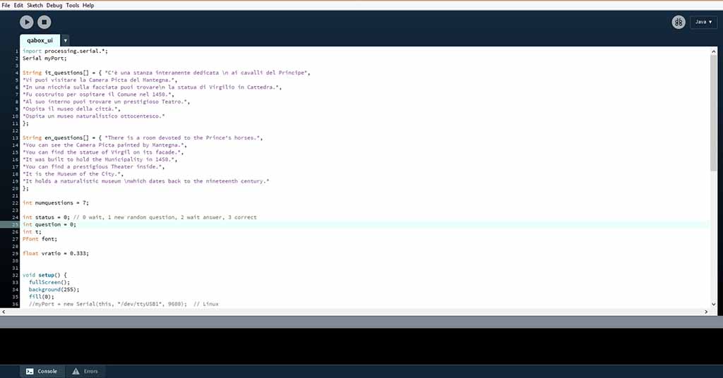 The Processing part (Fig. 20) is better explain in Assignment 16 (Interface and Application Programming). As I wrote above, the combination of pressed and unpressed buttons generates a value that the ATtiny sends through the serial port. The interface reads these value and waits a message from the serial port and when a new byte is received it generates a new question and sends its number to the board.