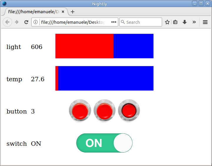 The JS code running on the web page receives the JSON, parses it and extract the values. Then, using DOM, the graphic elements of the pages are accessed through their IDs and are modified in real time. The code below shows how the elements are modified using the values obtained from the JSON.