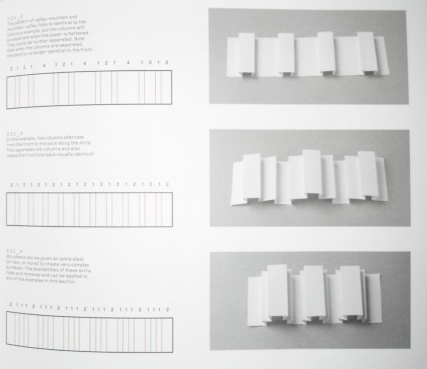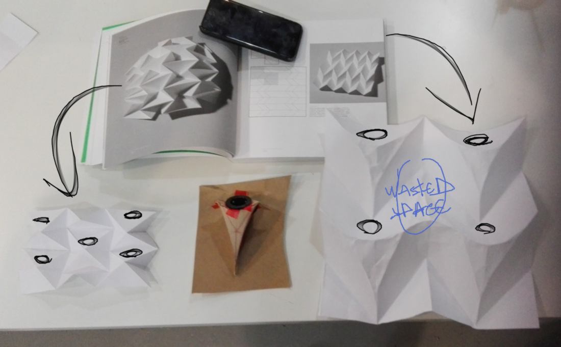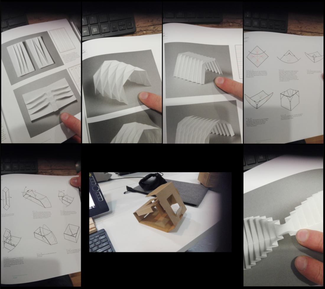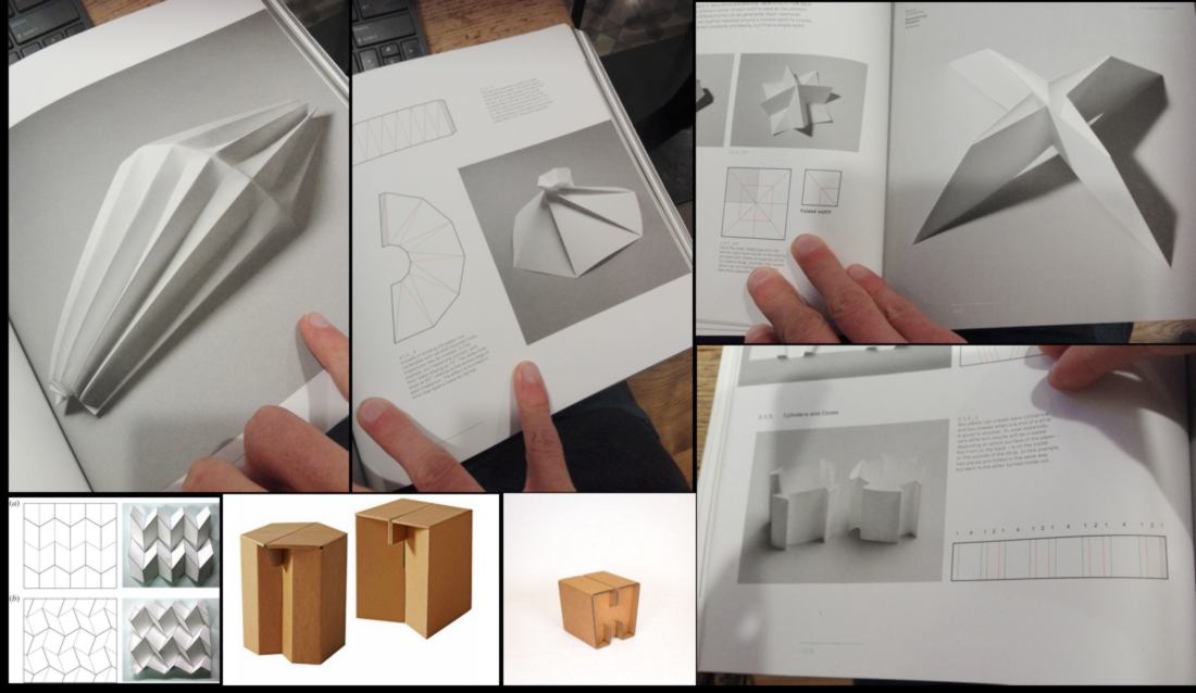 The design of the vertical stand might have to wait for the stand-alone seed incubator to be completed. The next step is to figure out how a 2d shape will turn into a 3d shape. I pick up a book from the shelf called "folding techniques for designers". I am fond of paper folding techniques. I am gathering all sorts of shapes that are either able to provide support, or showing visual appeal in relation with the theme: