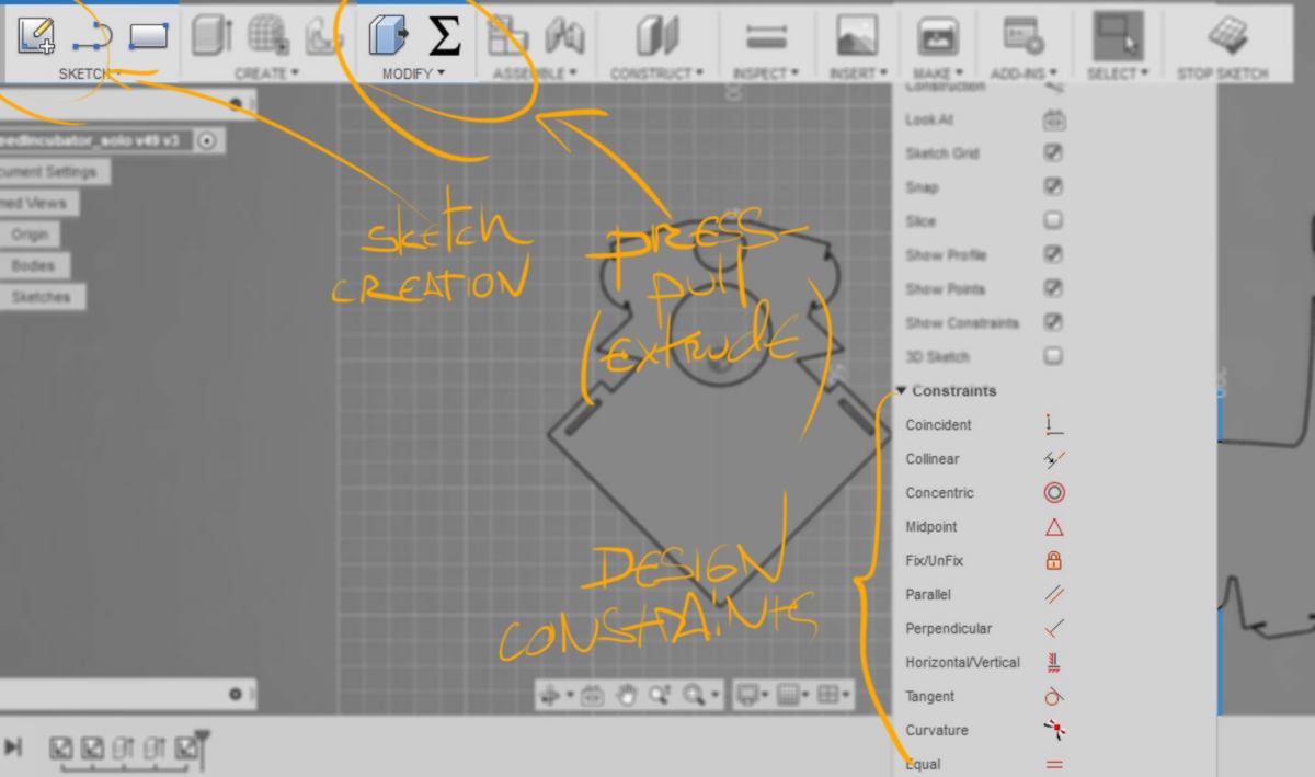 For the content of the educational platform, since I wish for these tutorials to be used by many labs in the future, with as little restriction as possible, It make sense to design using open-soure, free CAD softwares. However FreeCAD, one of them, is not as intuitive as Fusion360. Rotating around a model feels unatural. It will require some time to get used to it, or get to shape the tool to my preferences. Therefore, for testing purposes this week, I am going to work with fusion360. Between two classes with Ferdinand, I am briefly potting around with the parametric modeling system:
