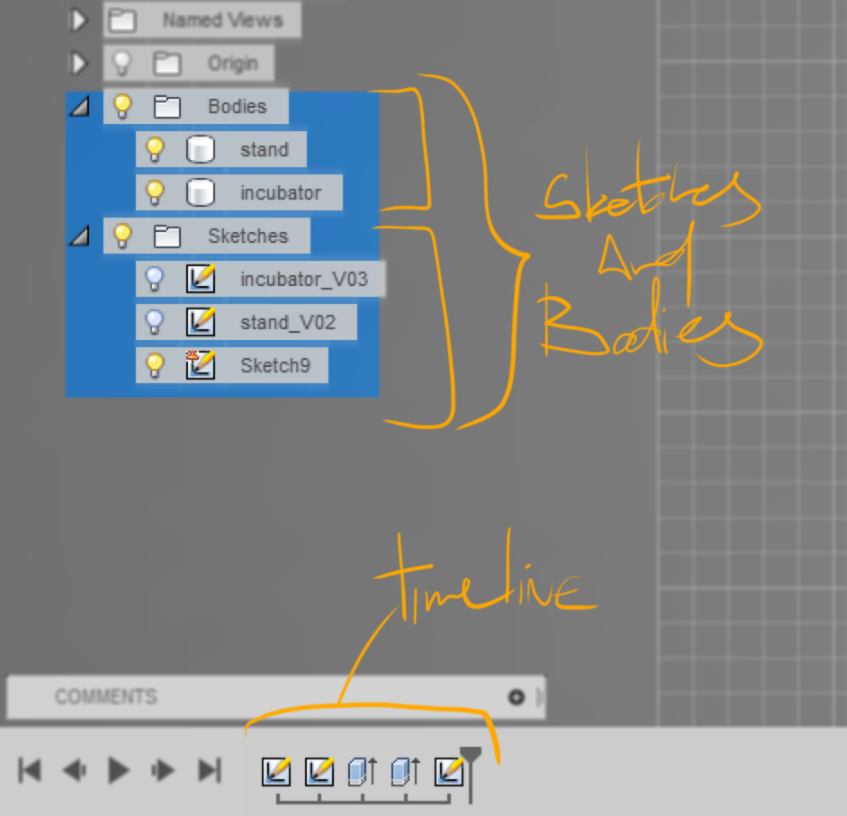 The concept of a timeline is also new to me. Although it is confusing at first ( I am used to sofware like 3dsMax where there is no such thing) it appears as very useful, being able to modify a sketch which then will influence the shape of any object based on it. The fact that sketches and bodies are separated but interrelated is new to me too. The difficult aspect of it is that I am used to have visual feedback, directly looking at and modifying a face of an object. I now have to name sketches and bodies so that connexions between them is obvious :