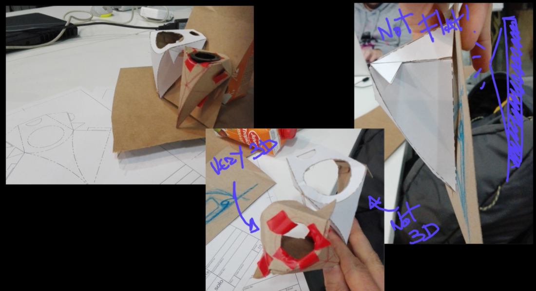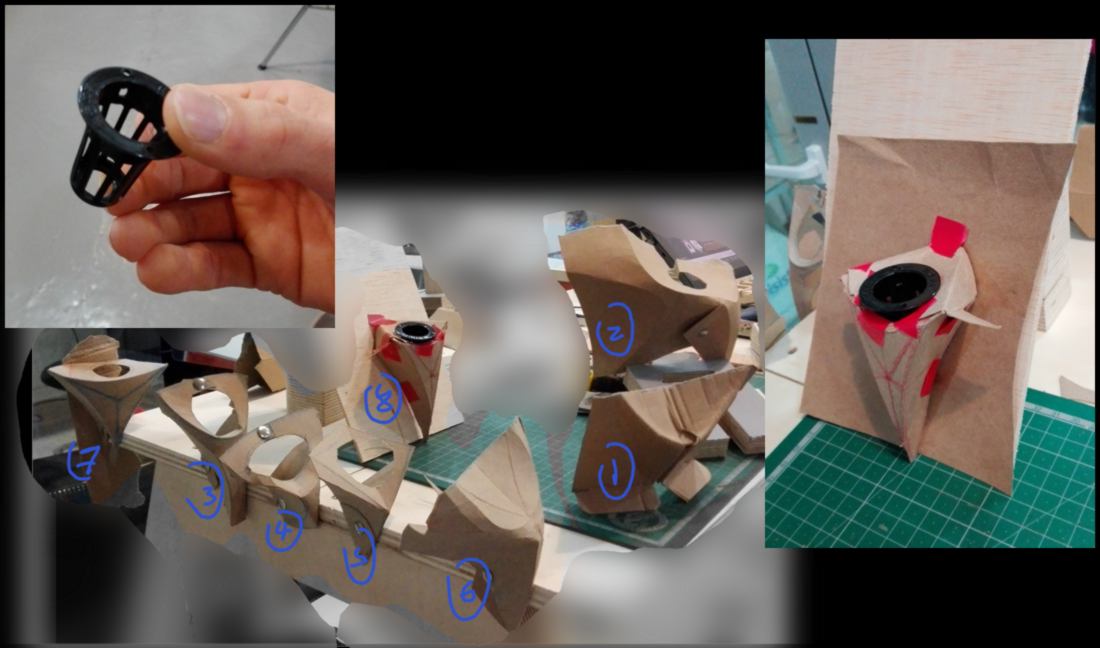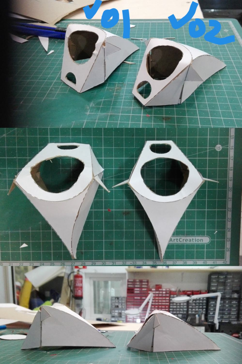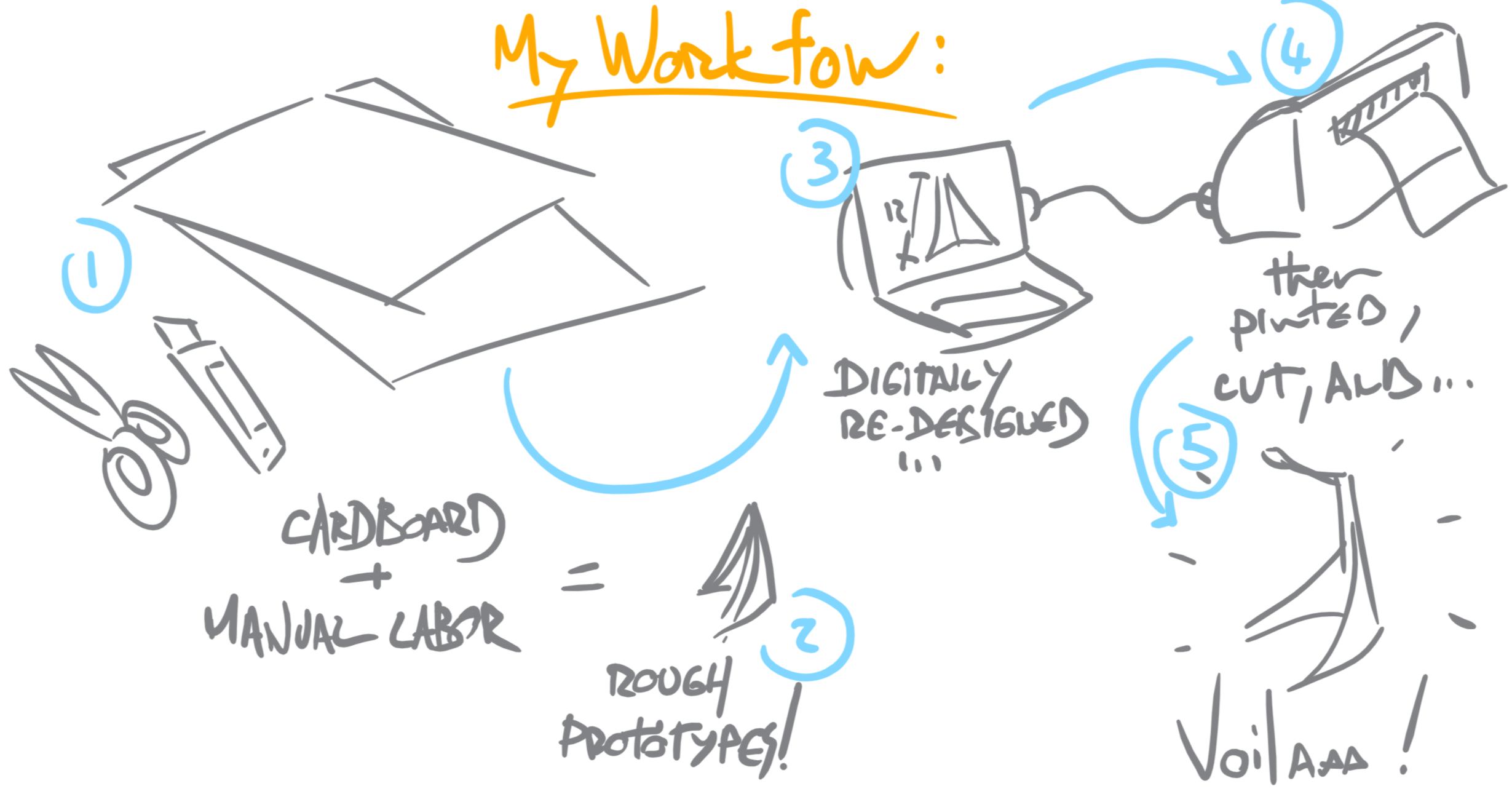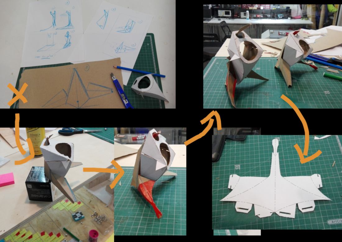 I also need to make a stand for it. The process is identical : I draw something quickly, then shape a prototype by cutting and sticking together some thick paper. I keep on modifying it to test different options. Once the model cannot take any other modifications, I create another copy, and modify it again, until I get what I want. Only then I draft the 2d model digitally, print it out, and fold it. I might keep on iterating the model for a bit, modifying the digital version, printing and folding it again and again, until the prototype is functional.