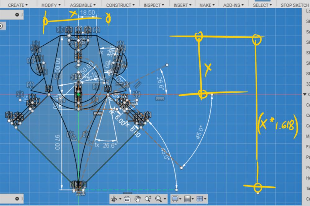 I have added one user parameter called "thickness_material" to adjust the size of the tabs according to the thickness of the material chosen, which is very likely to vary since materials will come out of scrap pieces of cardboard. Also, out of curiosity, I have adjusted my initial design so that the general proportions of this design respect the golden number: