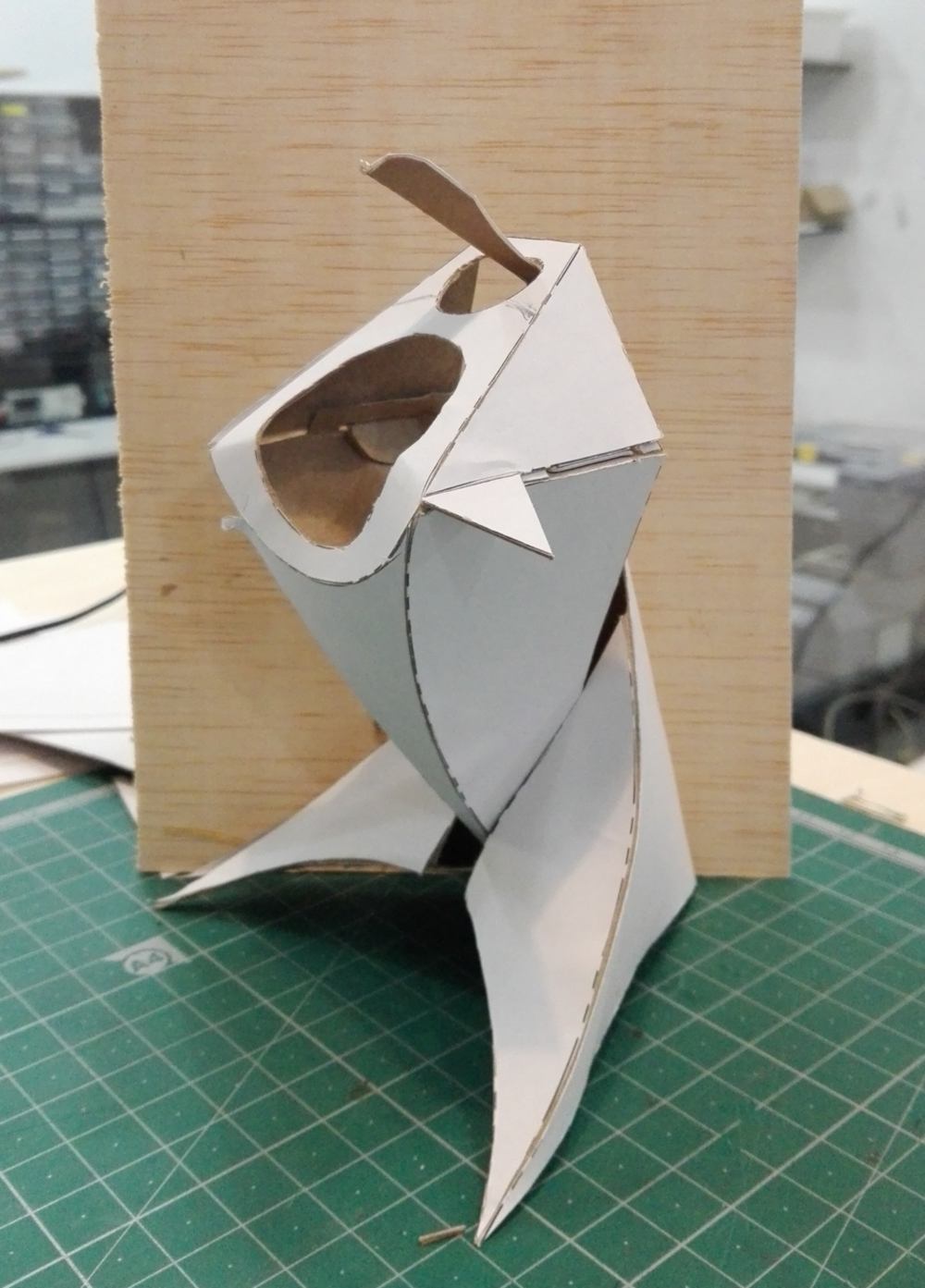 From a technical perspective, Fusion360 is giving me a hard time. When modifying the original design again and again, Fusion360 starts slowing down and crashed a few times. To remedy to that I created a new sketch based on my original one and it now works fine. I have (2D) printed and put together a model. I am happy about the tabs, it holds very well, however I need to make the width of the gap twice longer since I have to fold the cardboard to fit it in. Other things must be corrected : the model does not have a flat back, and the top part of the shape has lost some 3D "feel", which makes it looks a little heavier and clunky.