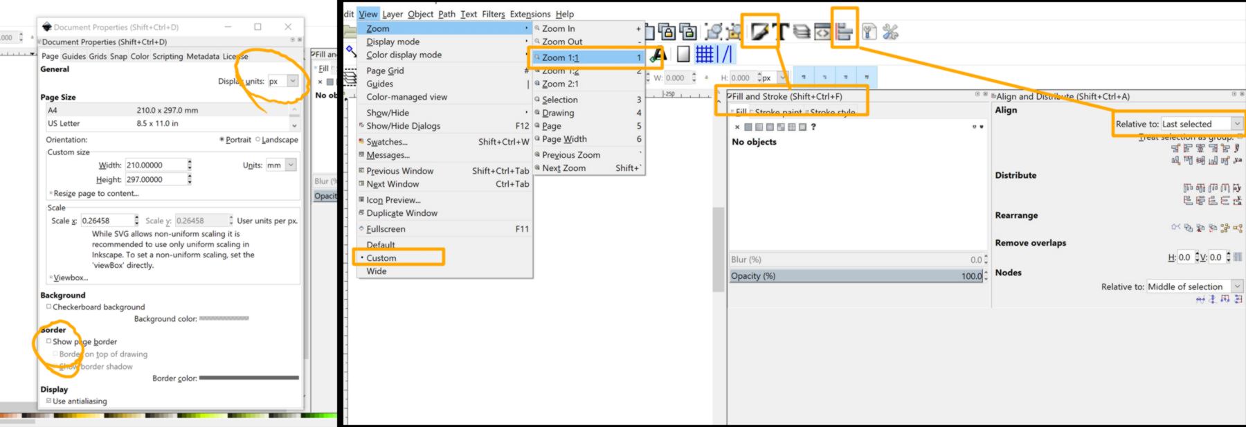 First I set up my document property so I do not have defined borders, and use pixels as a unit. I set up my view as "custom", change the zoom for real-size (1:1), change my alignment setup to "last selected", and display the fill and stroke window.