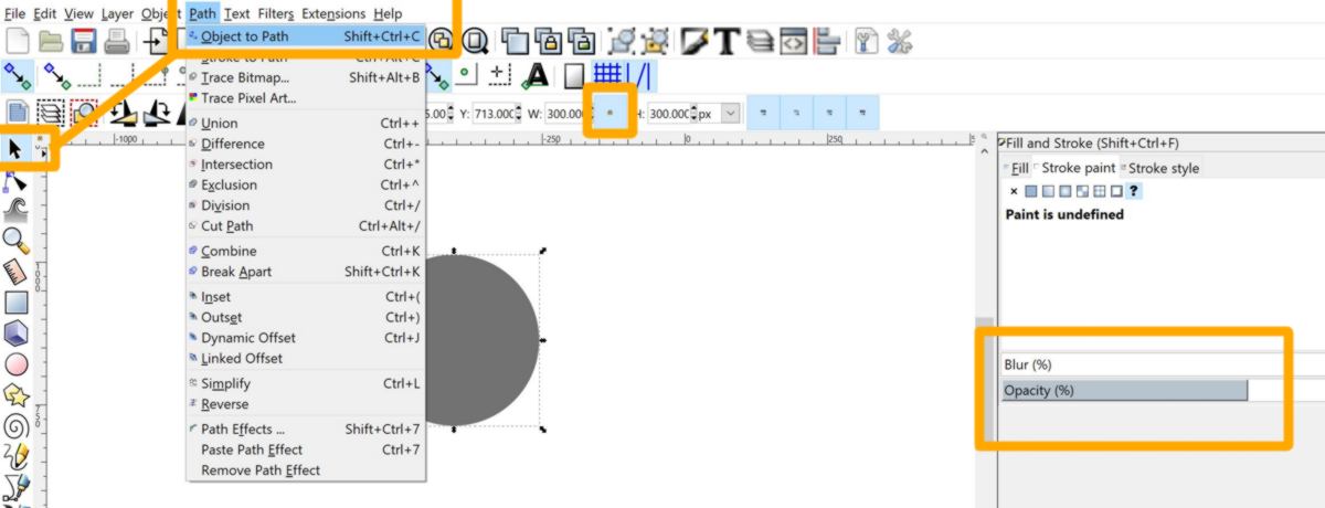 Now I start drawing, using ctrl+shift to draw a perfect circle, then convert this object into a path, drop the opacity to about 50 percent, and change its size to 300px using the lock to lock the width/length ratio of the object before resizing it.