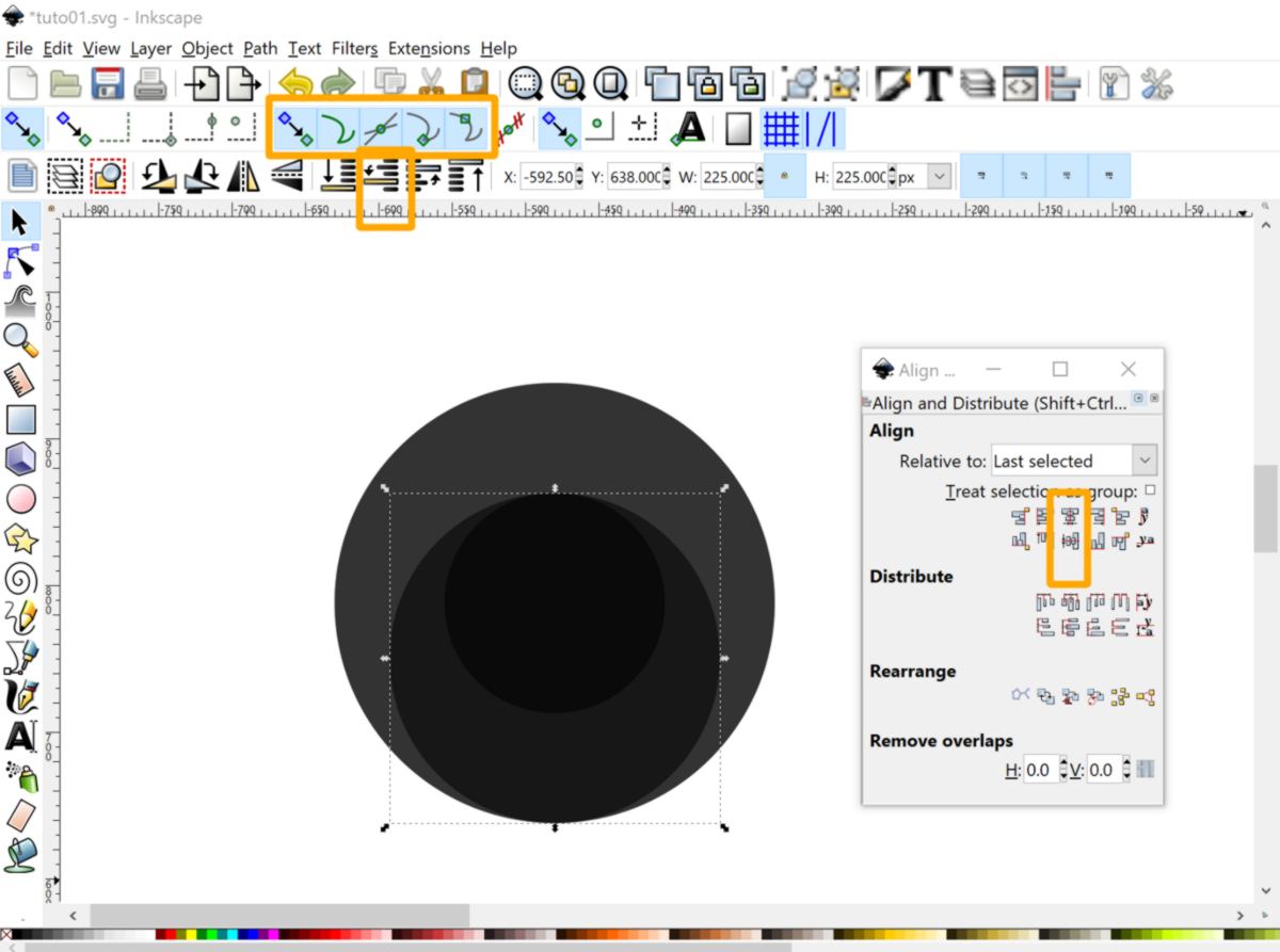 I then duplicate the circle, resize it and align it with the other one using the align tools. I then switch on snap tools for paths, duplicate the small circle and align the bottom to the bottom of the large circle, then drop it by one step using the "one step down" button.That will allow me to select the smaller circle and modify its color in the next step.