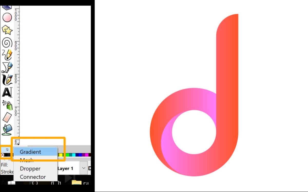 This gymnastic of duplicating then selecting and modifying shapes takes a bit to get used to, but it comes handy. I then color each shape using the gradient tool (a bit harder to find on my screen, smaller than average). And here we have a d-shaped logo with a 3d-render to it!