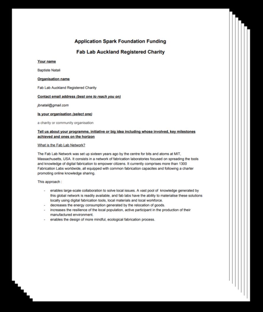 22.02.18 / I write an application for funding for Fab Lab Auckland. A big telecom company called Spark has set up a foundation called the Spark Foundation and is looking for long term partners to start community projects focused on young people, education and digital enablement. The deadline for the first round of application is on Friday the 23rd at 5am. In collaboration with Gribblehirst community hub, a community organisation in Auckland, I spend my evenings drafting the application. I also get an in-depth feedback from Mathilde before re-editing the document again. Here it is: