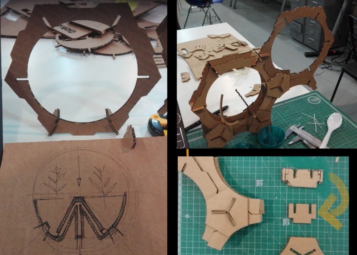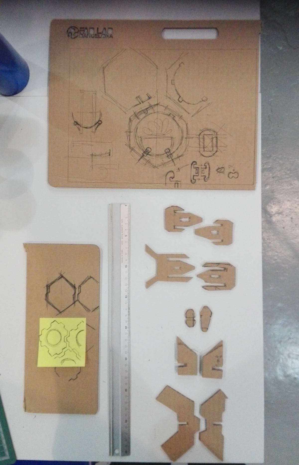 26.02.18 / I put some time aside to develop the green wall. I prototype the structure which will eventually hold the containers for the plant, which will be 3d printed. Following my many attempts over the last few weeks I draft an hexagonal shape which can be stacked with little waste of space. I then use a mix of hand-cut and laser-cut cardboard shapes, recycling leftovers from a weekend workshop, to develop different solutions for the attachment systems :