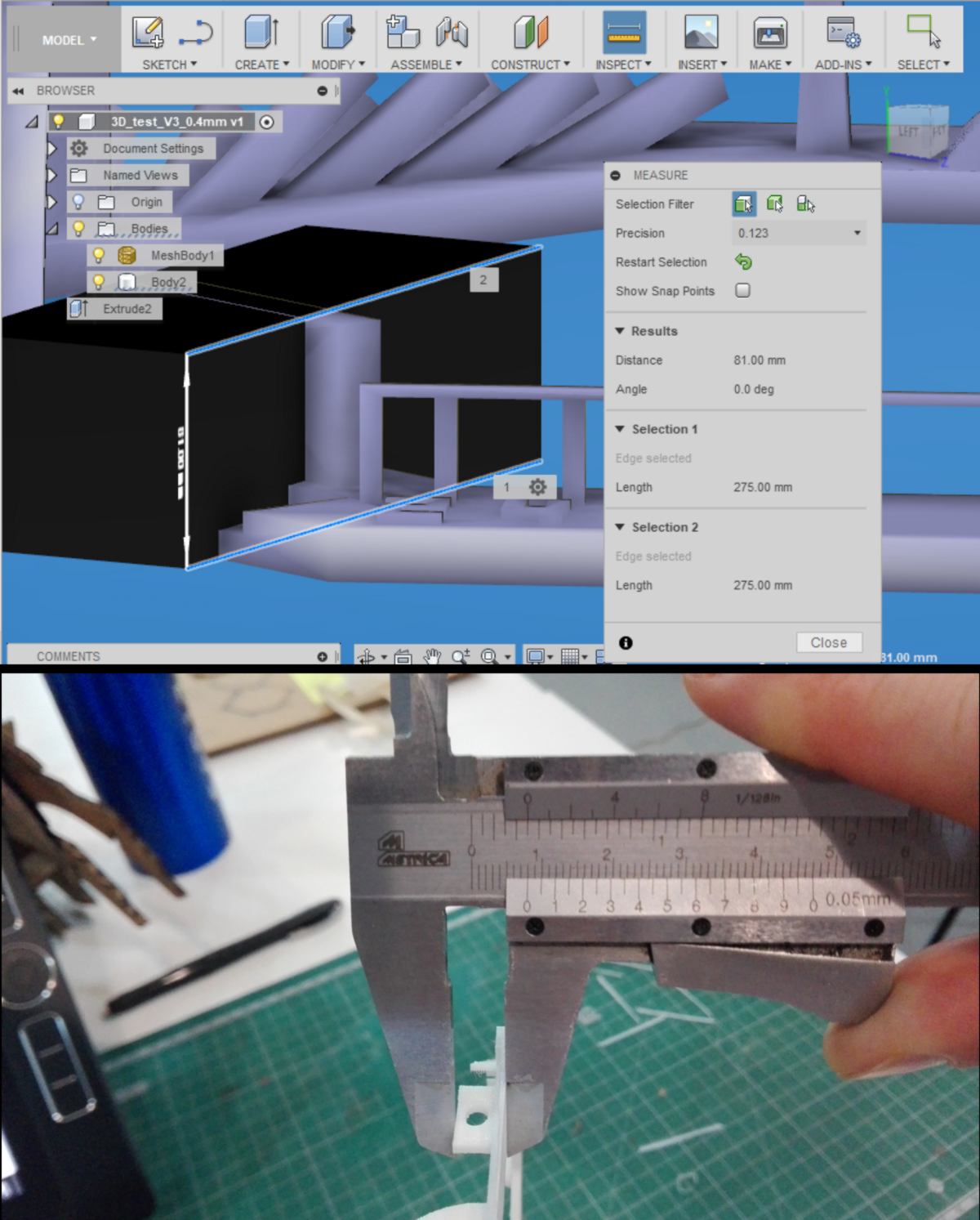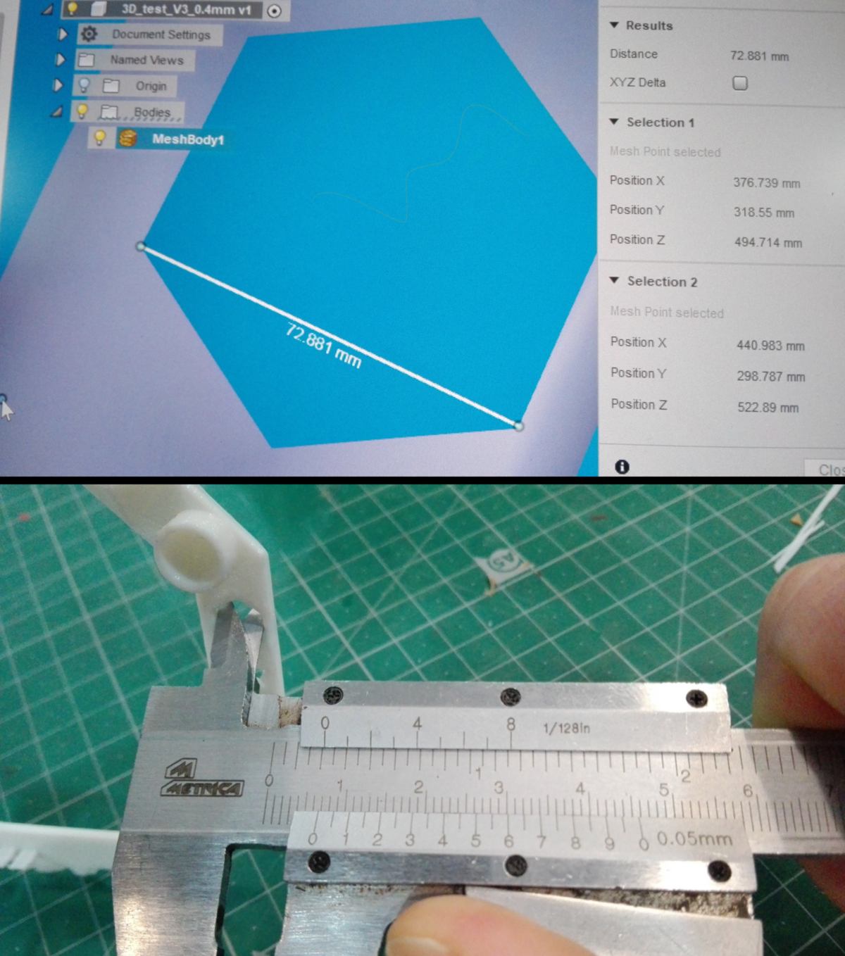 What I measured was a spacing between two printed areas. On all models, I lose some definition due to the line width. The prints tend to "thicken" the dimensions by around 1 mm. When comparing two prints from printers with different nozzle size, we can notice a difference of width, sometimes filling space that were empty in the initial digital design: