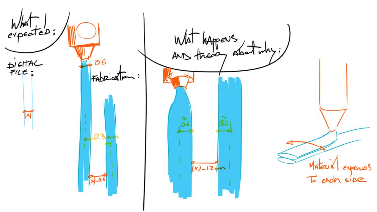 The final width also depends on the amount of material pushed through the nozzle. This is particularly obvious on clay printing: