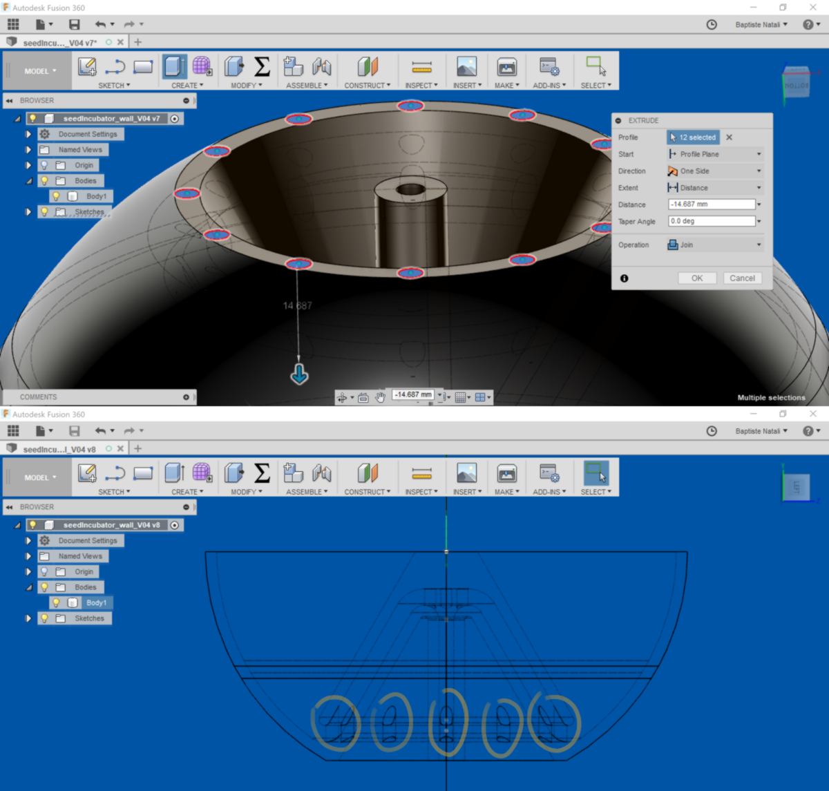 I make time to work on my personal project, designing a supporting, waterproof stucture for the plant with an embeeded siphon system. This shape possesses an inner chamber with makes it impossible to fabricate with a 3axis CNC machine with substractive process :
