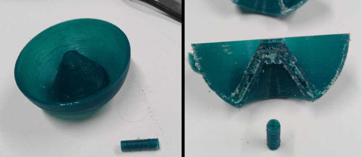 For now, I am reverting back to PLA to carry on with the prototype of the plant container. the reduced-scale prototype with added support has printed well but the water is not siphoned properly. I cut the model in half to diagnose the issue :