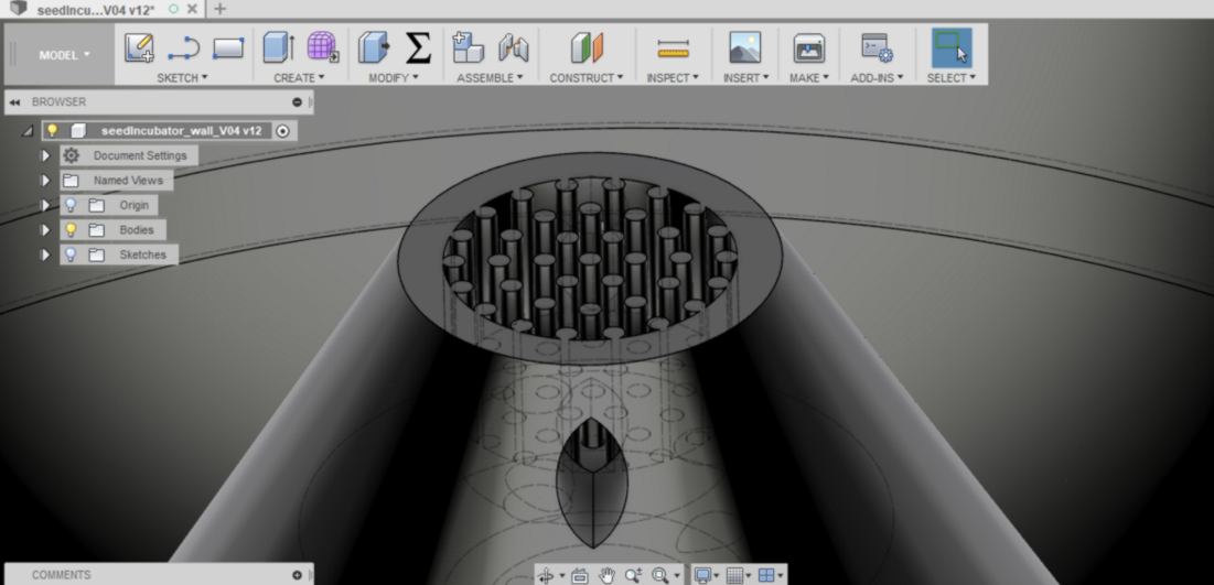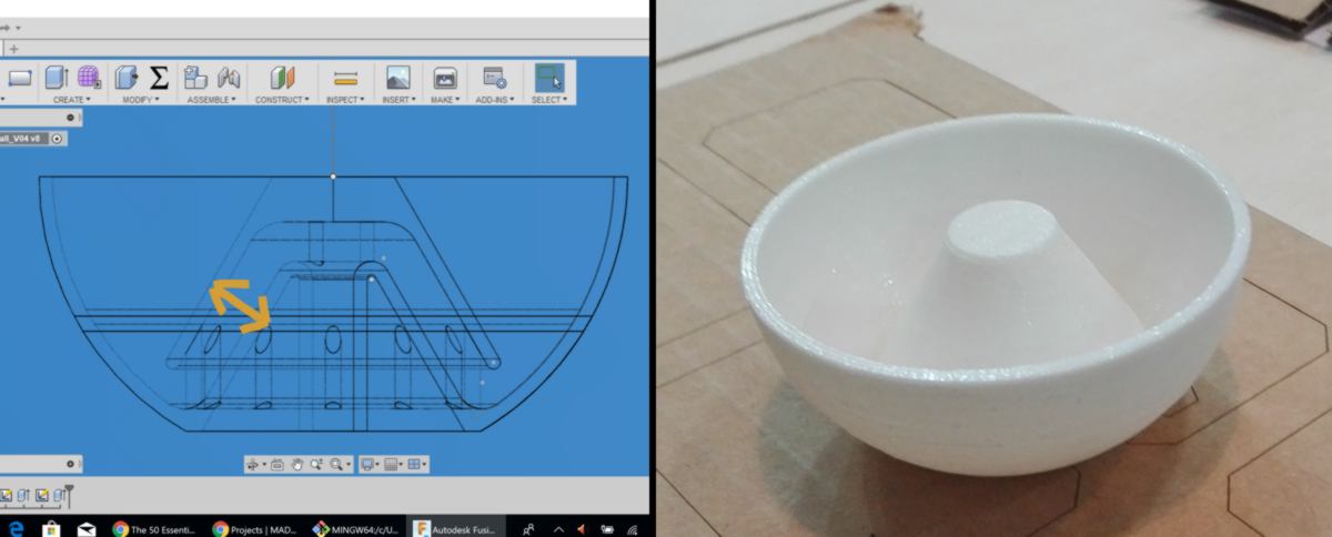 With this modification, the siphon system works properly, meaning that the siphon will work in the real-size model. Before I send it to print, I make a last addition to the design : an anti-splash system. The input of water will come from another container located right above it and will hit the container straight in the middle. For now, the middle is flat, therefore the water will spash everywhere, which will be messy and lead to water loss in the system. I find a bit of inspiration online and humbly design a first test :