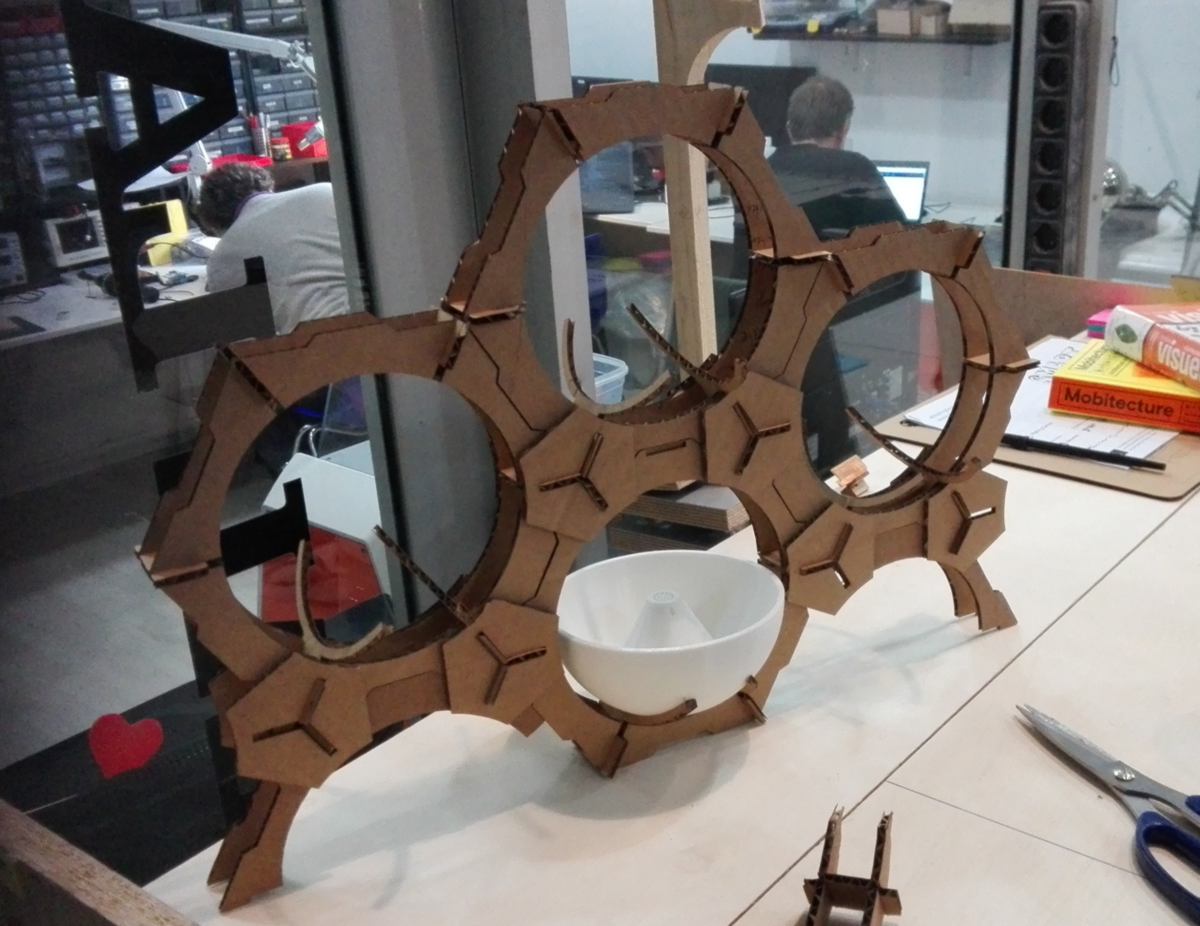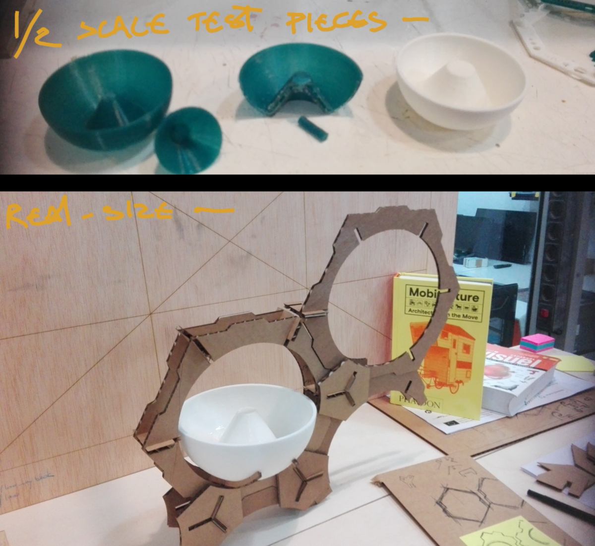 After many test-pieces I finally add a real-size 3d printed model to the cardboard wall :
