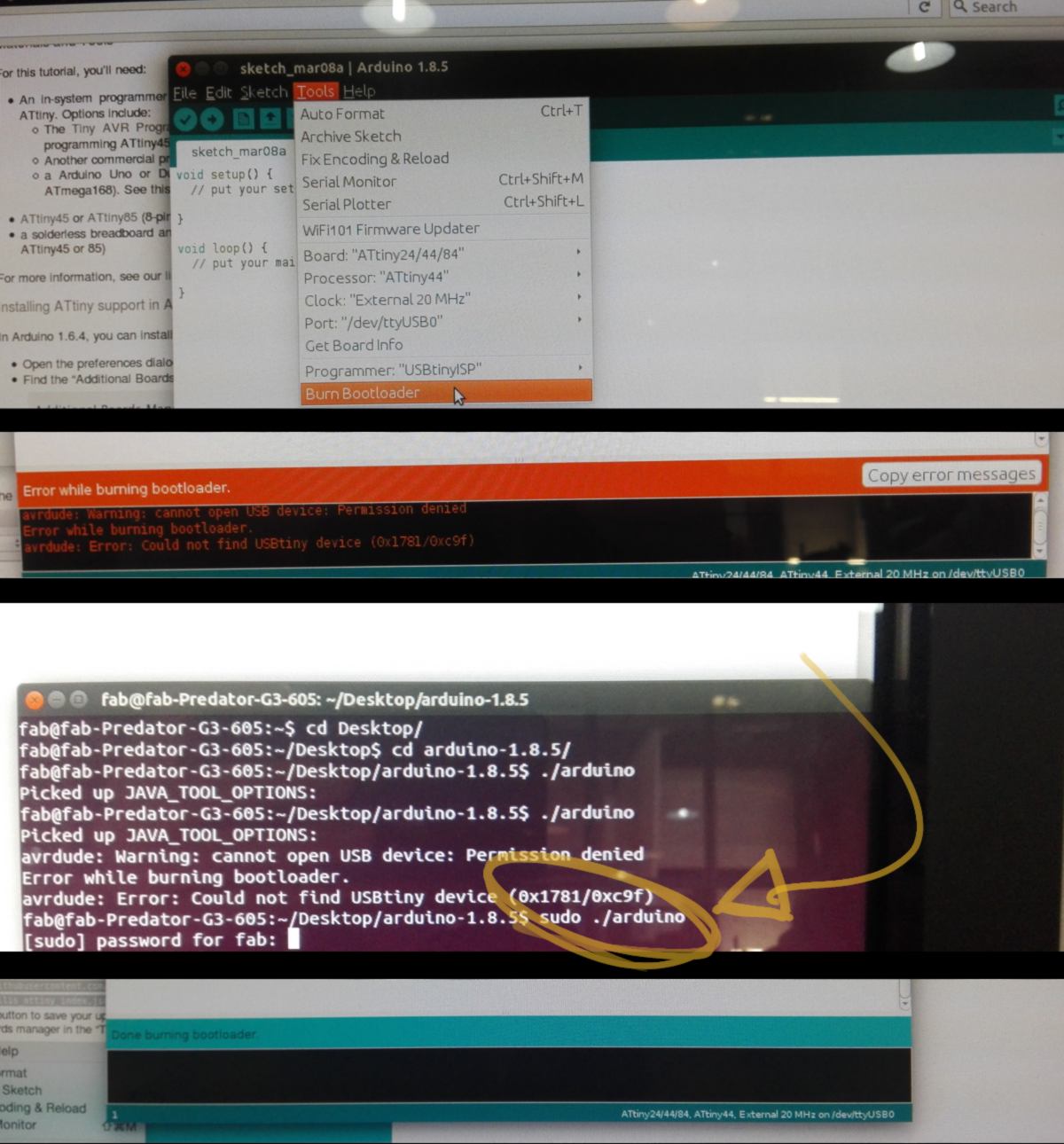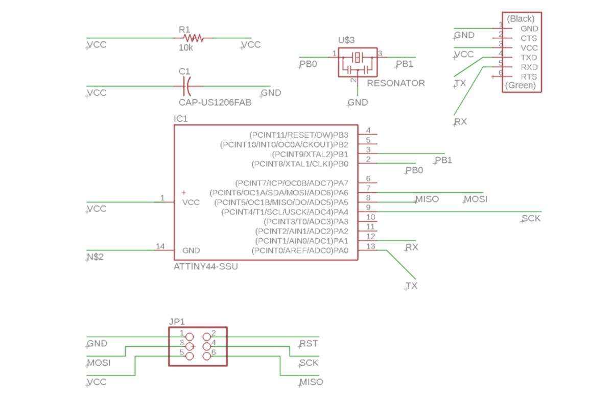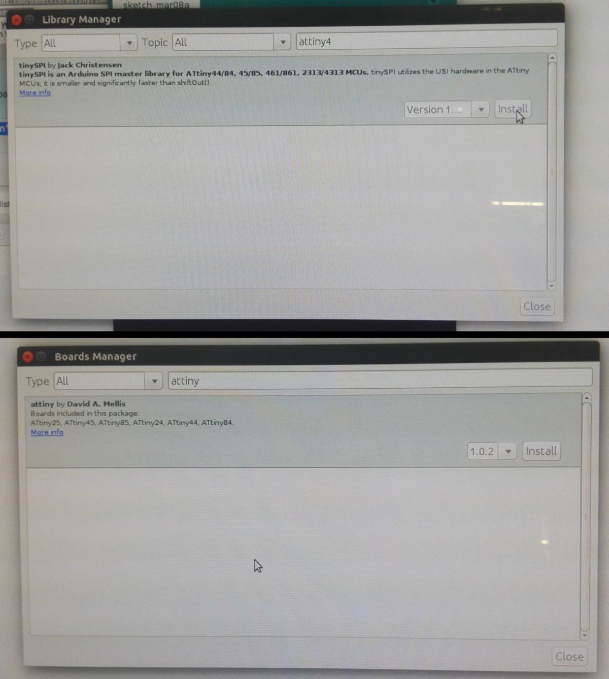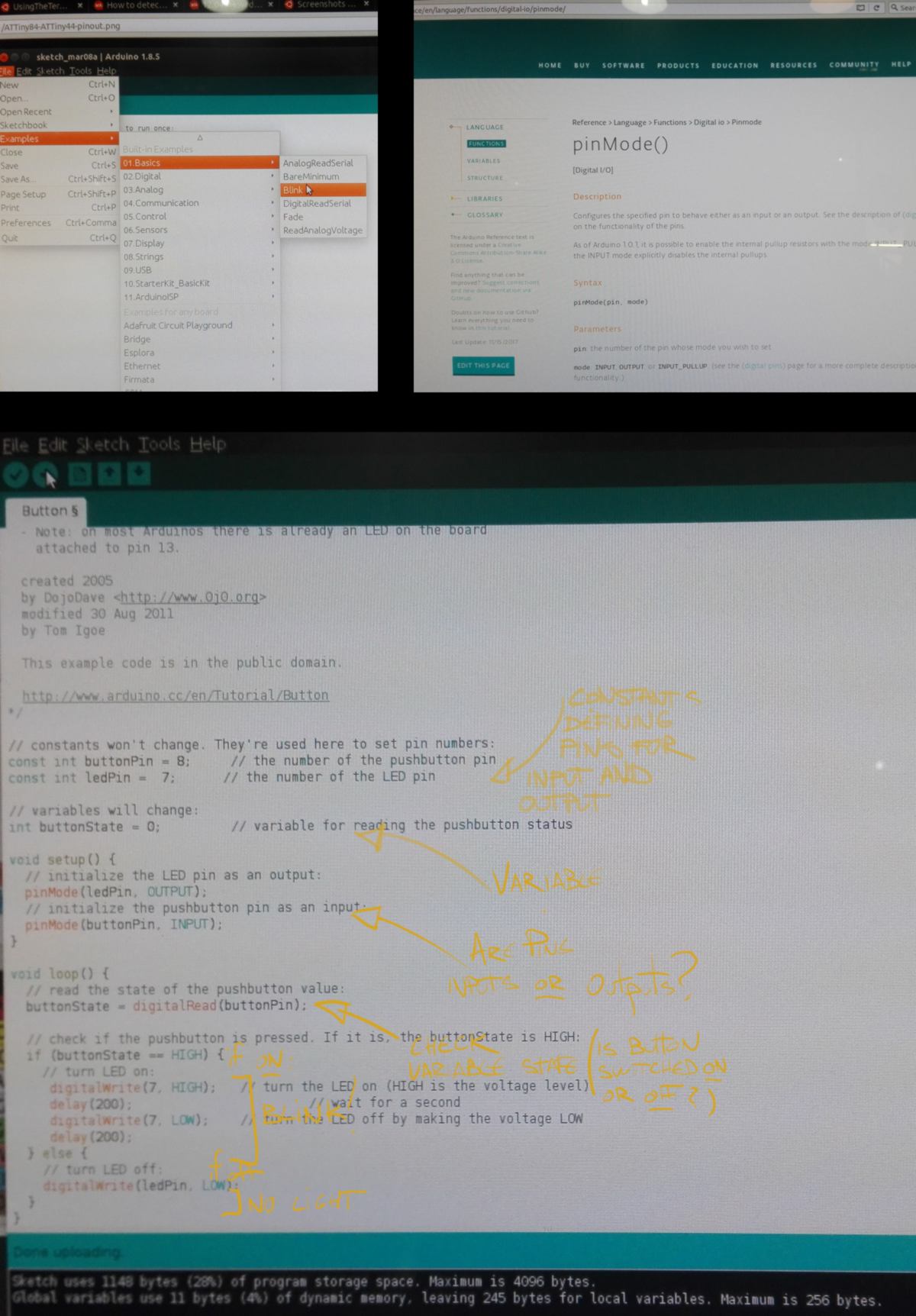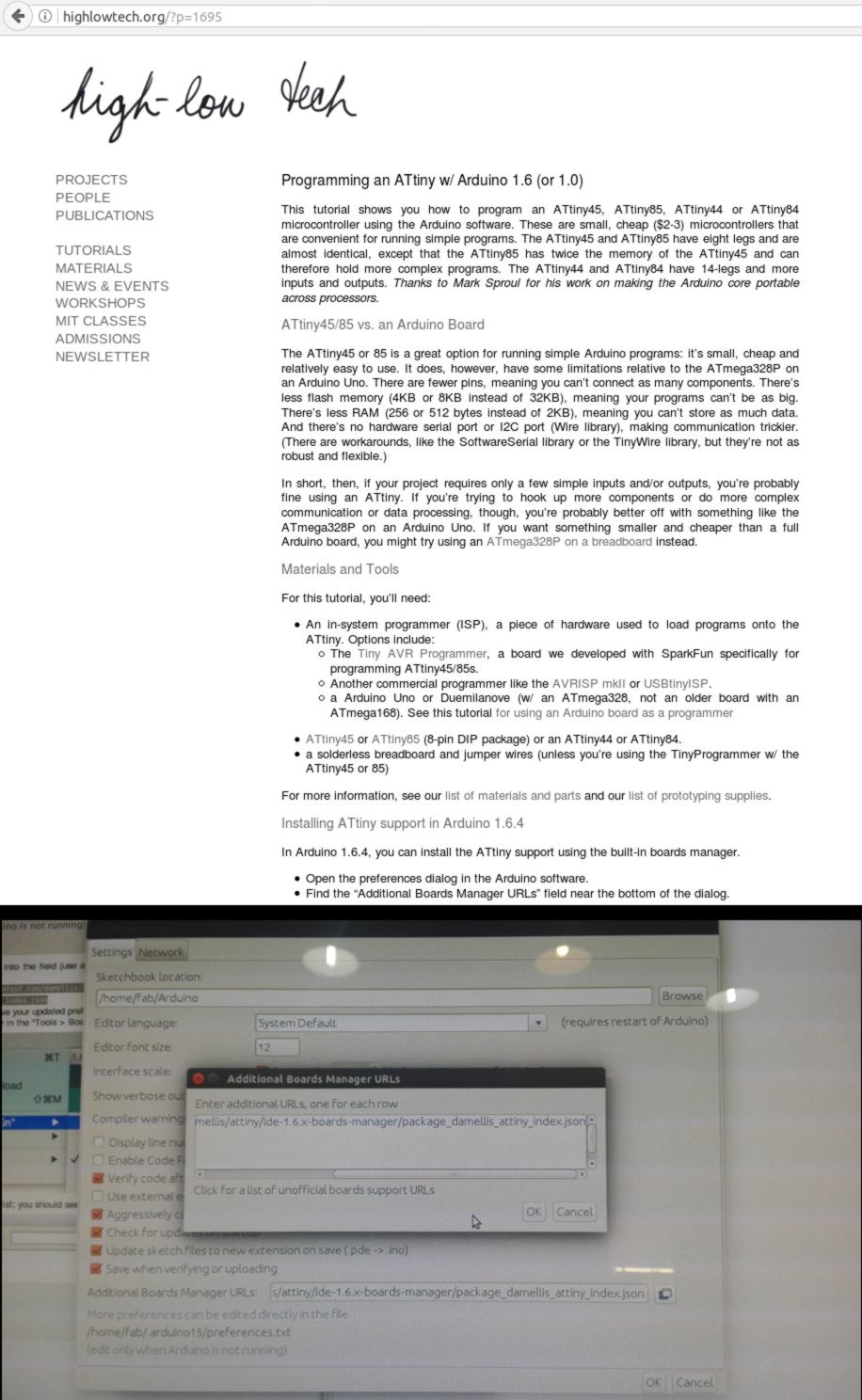 I wish to go one step further, programming this board in a similar way as the simulation I ran yesterday. To do so, I need to load a library for the arduino IDE. A website called high low tech describes this process accurately. The first step is to target a board library which enables the Arduino IDE to communicate with the Attiny44 :