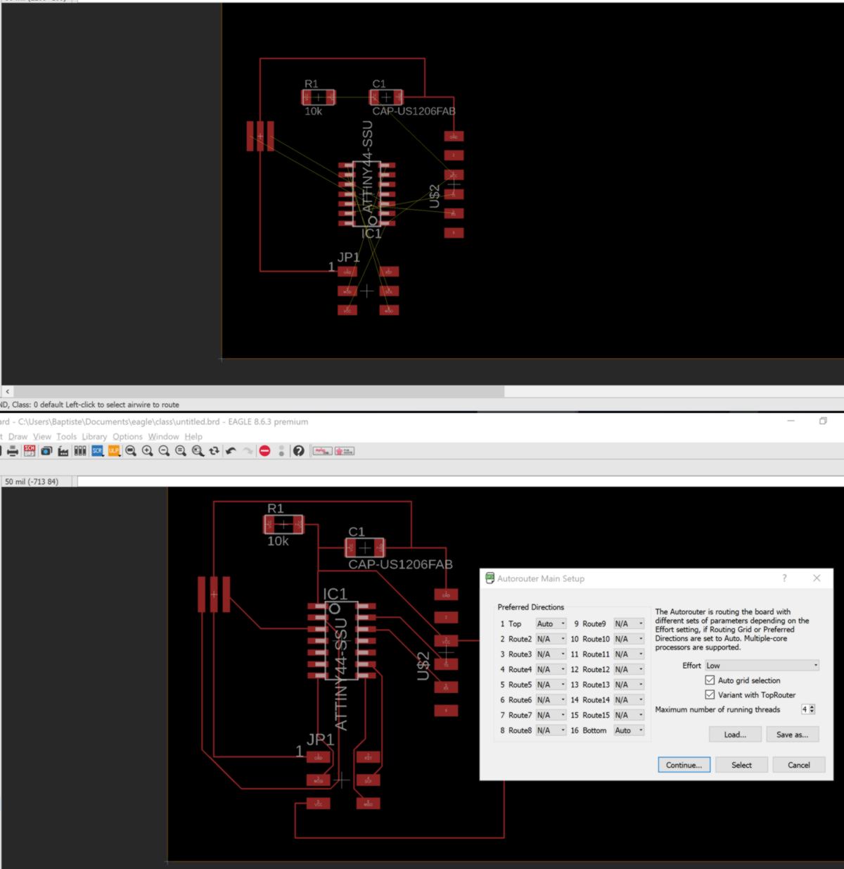 For now, my goal is merely to copy the board offered as an example. Once done, I switch to the board view, where all my element are at scale and connected by airwires. I need to turn these airwires into proper traces, which is usually a puzzle. I look for an automatisation of this task, which makes the job easier :