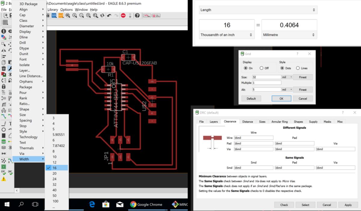 I am being reminded of design rules about PCB, and defines the width of all traces and minimum clearance between them. Remembering the test piece we cut two weeks ago, I enter 16 mil, which is slightly larger than the width of our 1/64 cutting tool, as a basic value for all elements. I also discover the ability to add a grid adapted to these measurements: