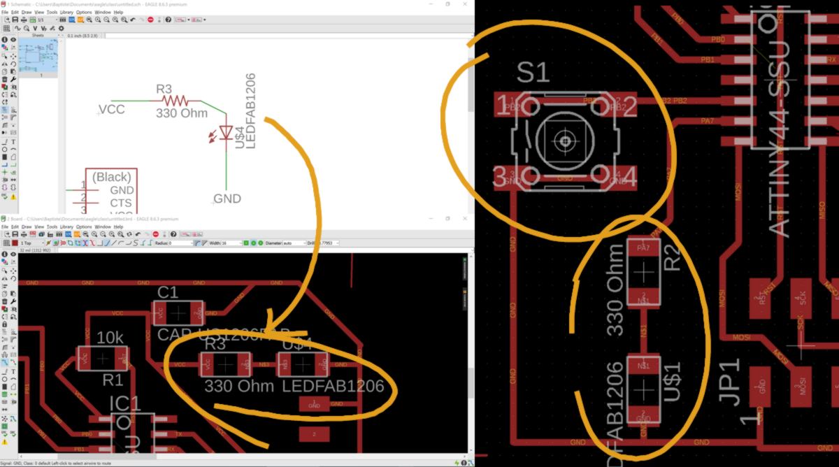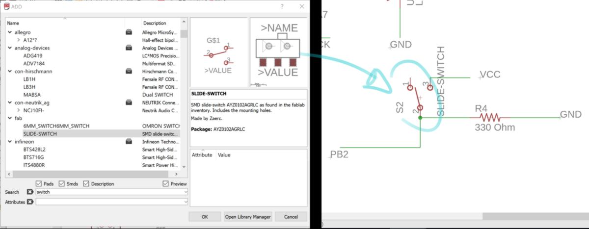 As a second step, I add additional elements to the board. Eagle enables me to switch back to the schematic view and add a switch, an LED and its resistor, as well as an extra LED + resistor bundle, which will light up when the board is powered :