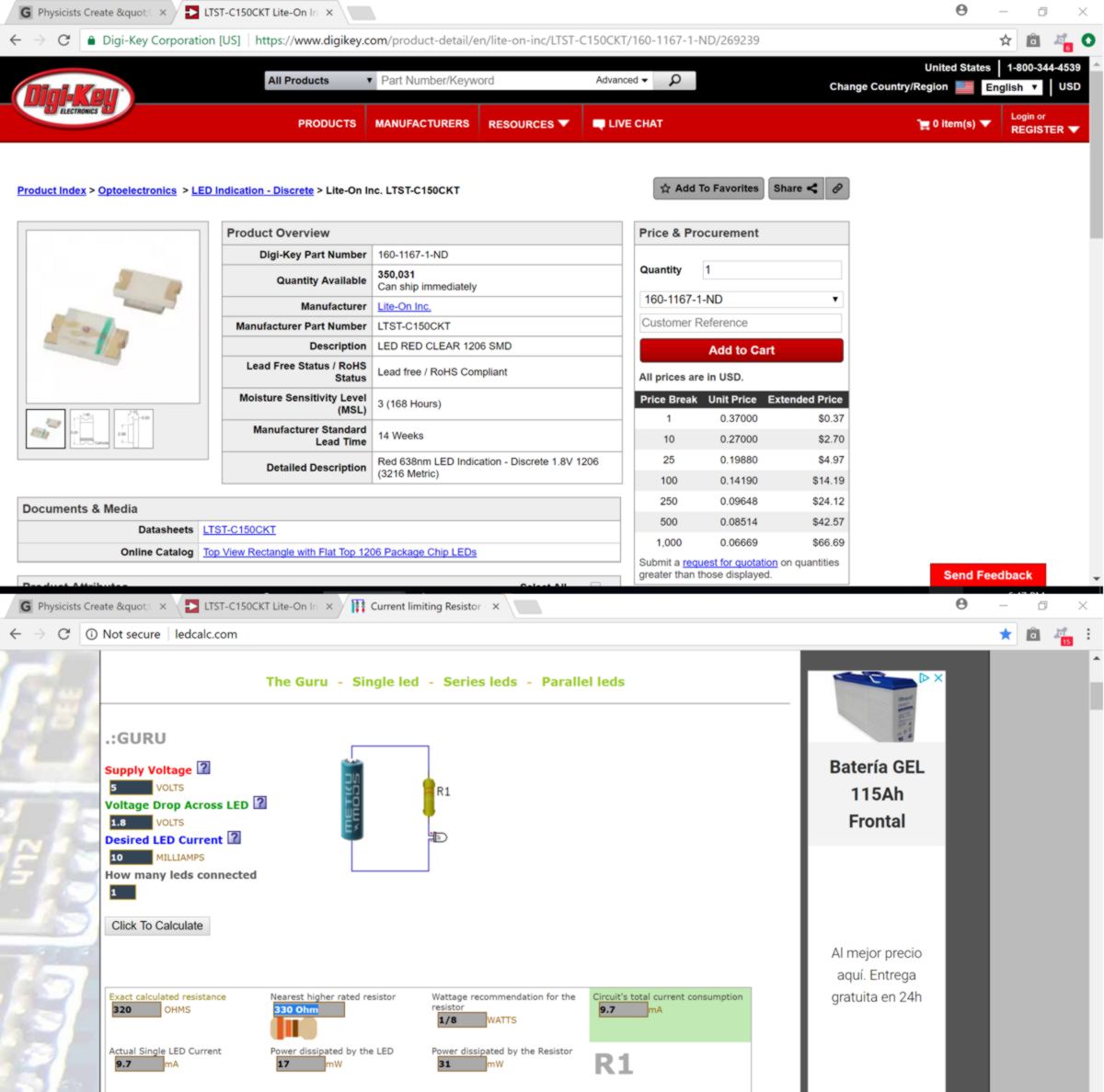 About the resistors, I calculate their resistance online, using the digi-key reference of the LED and a website offering a generic calculator based on Ohm's Law. It recommends the use of 330 ohms, but I know we do not have them here, so I will end up using resistors with 490 ohms, the closest value available, so as to not blow up my LEDs :