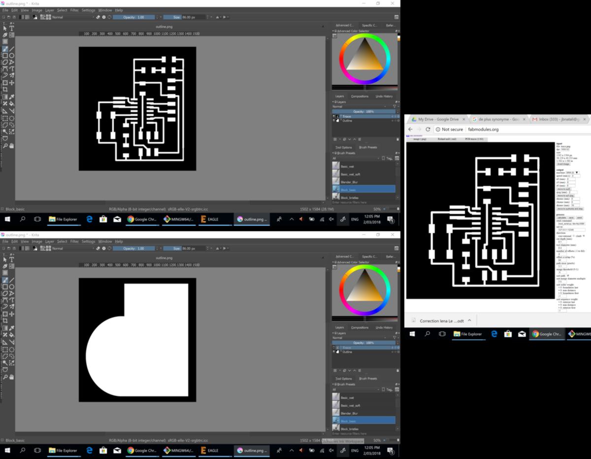 In Krita, I create an extra file based on the one I just exported. This file will be used to cut out the board. I will then use fabModules to generate the g-code required by the precision milling machine. It is identical to what we did one week ago :