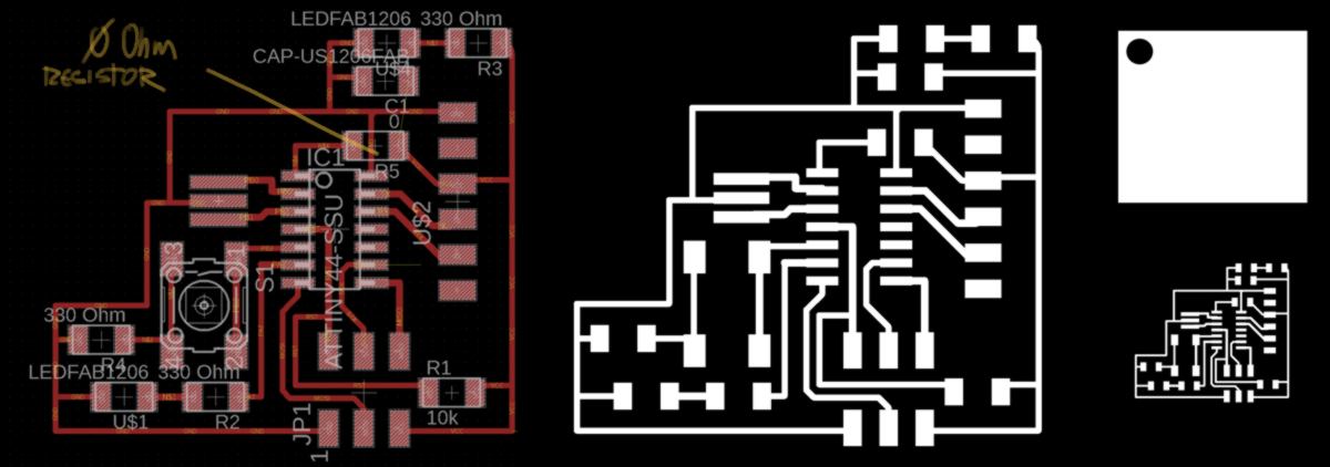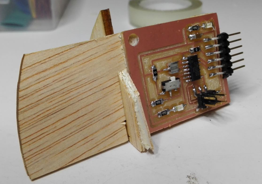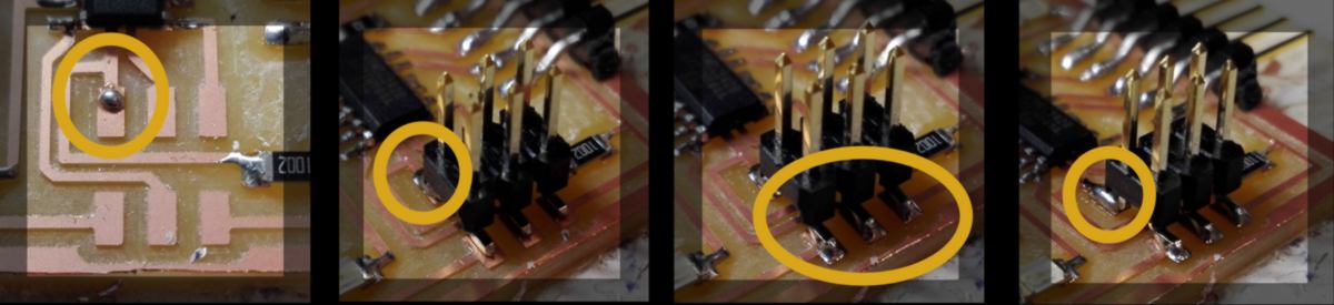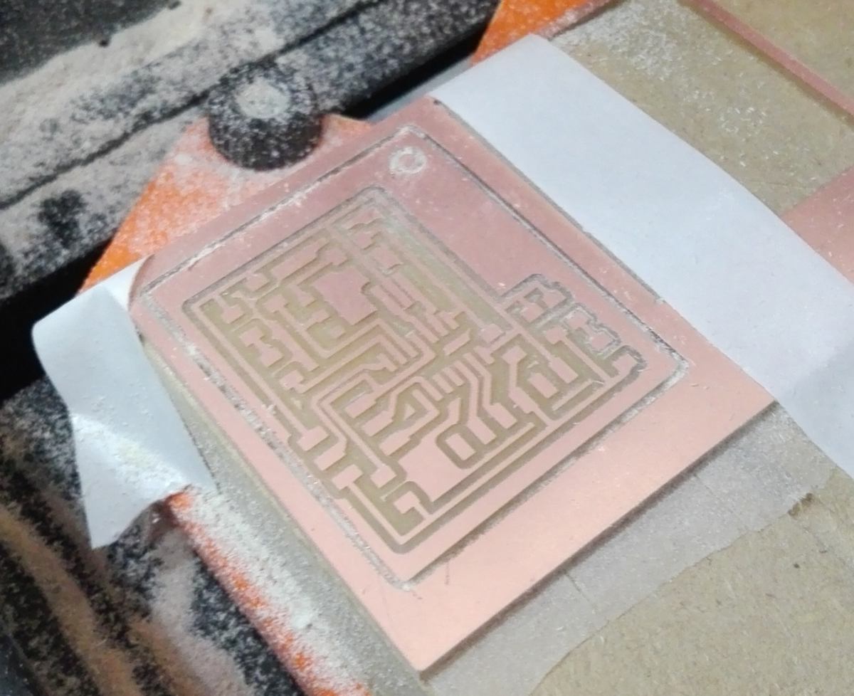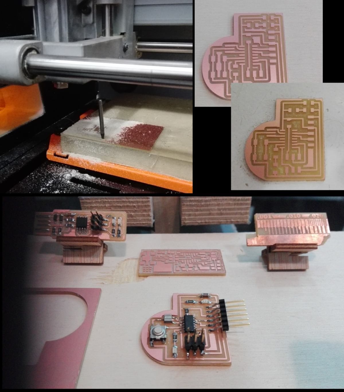 I then, following the exact same workflow as two weeks ago, mill the pcb, collect and solder all components. One fun fact was that the 1/64 end mill at the very end of its cut, stayed stuck on my PCB, the machine heading back to it neutral position on its own. It somehow did not influence the quality of the cut, which actually went slightly through the board - our board are, as I discover today, thinner than the one set up by default in fabModules.
