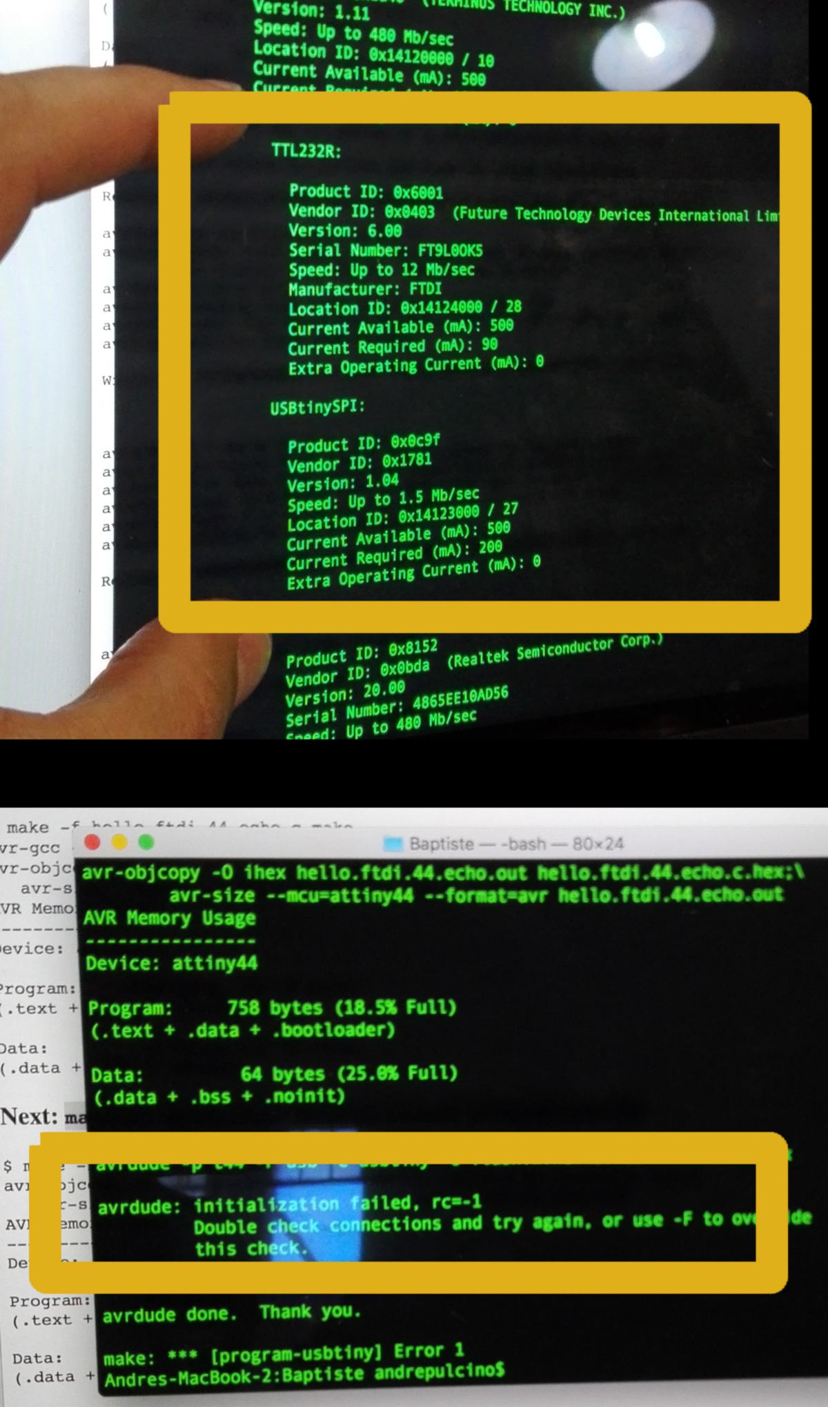 I first double check that both boards are detected by the computer, then begin to enter the command lines. At the second stage, I happen to get a warning :