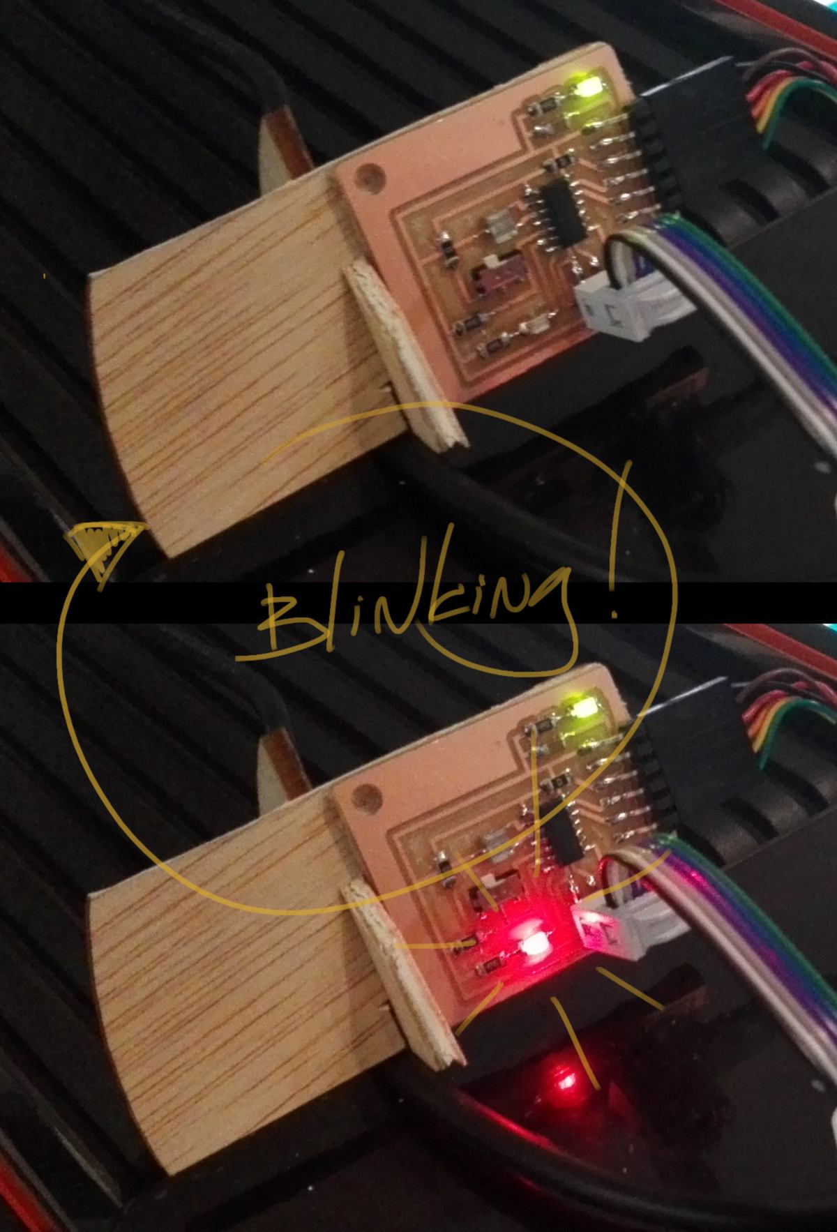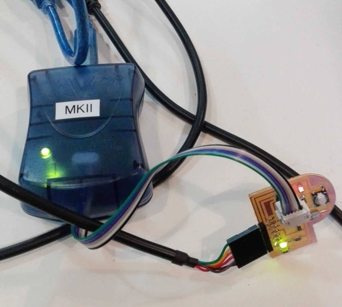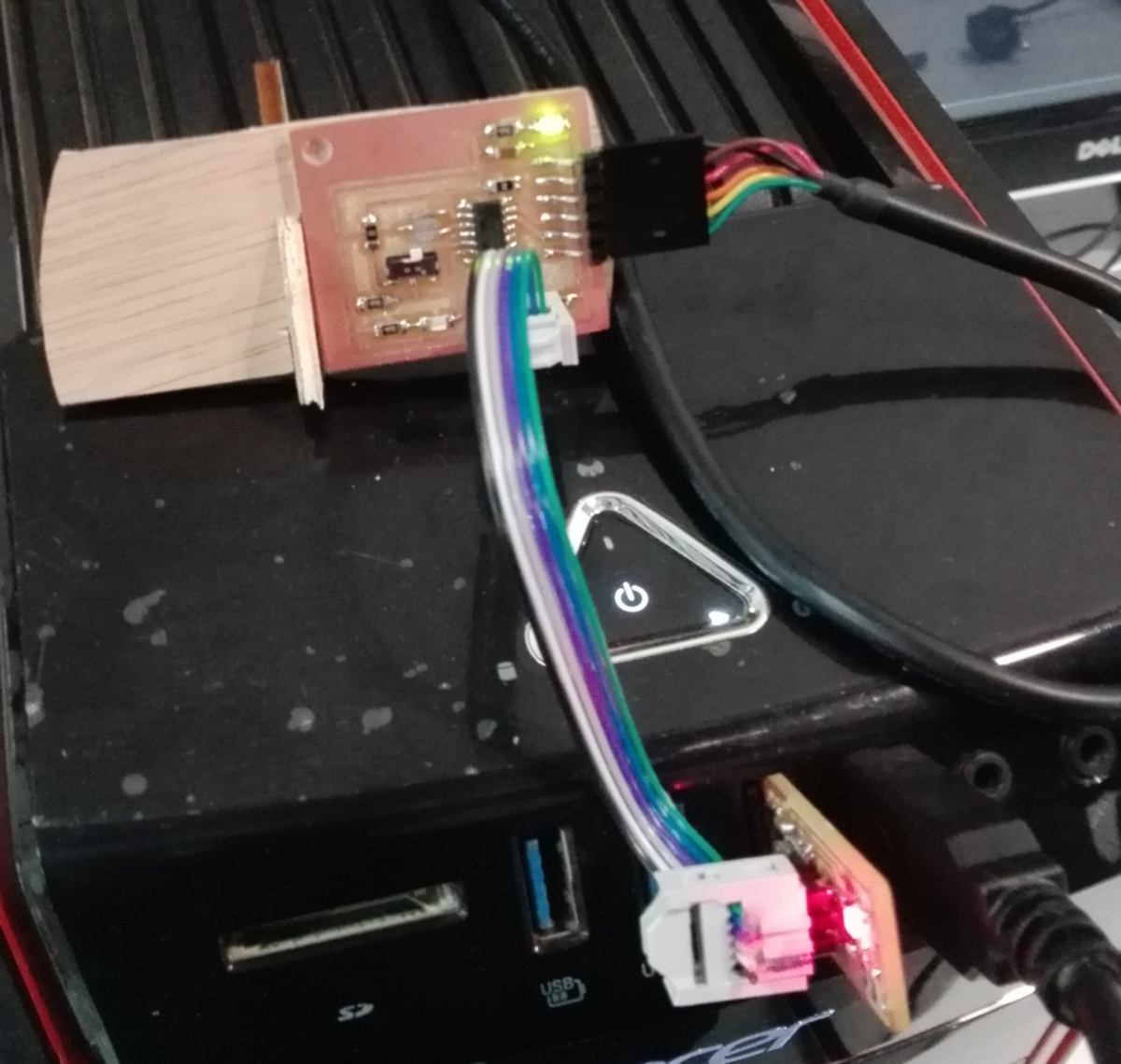 I then connect my programer and the board to the computer. Since I do not want to use my Wacom to do any programing, I will switch computers a few times today, experiencing both Linux and Mac environment. The extra LED that I added to the design lights up, providing me feedback. The board is correctly powered :