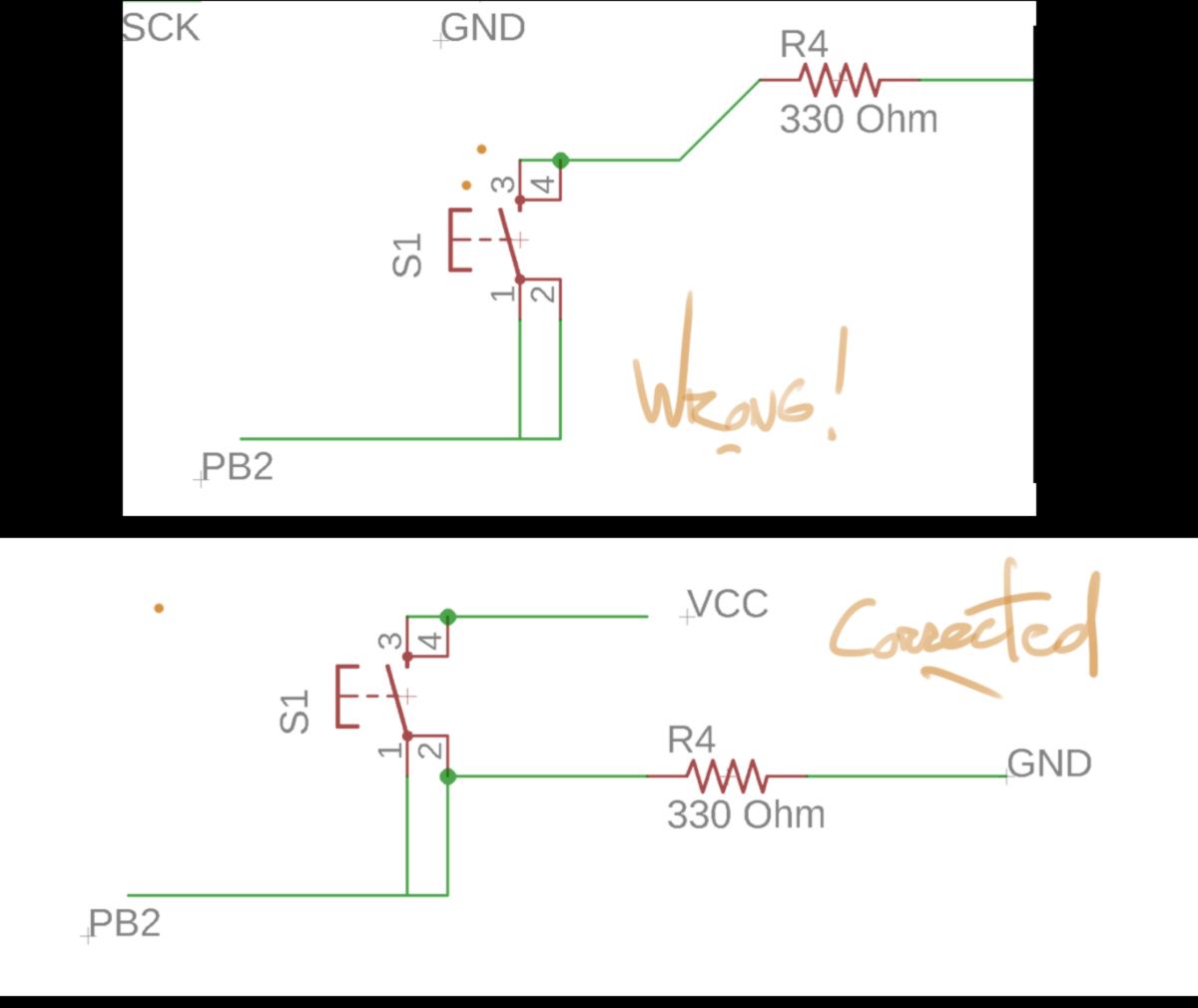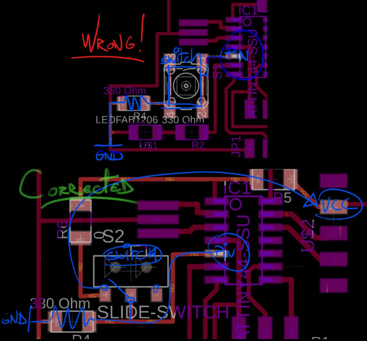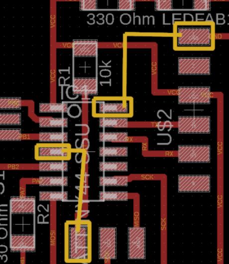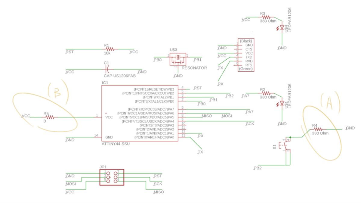 I then add an extra resistor to the switch (A), under recommendation of my tutors. Accessing the VCC of the microprocessor has become quite difficut so I also add a 0 Ohm resistor to allow the VCC trace to jump over another one (B):
