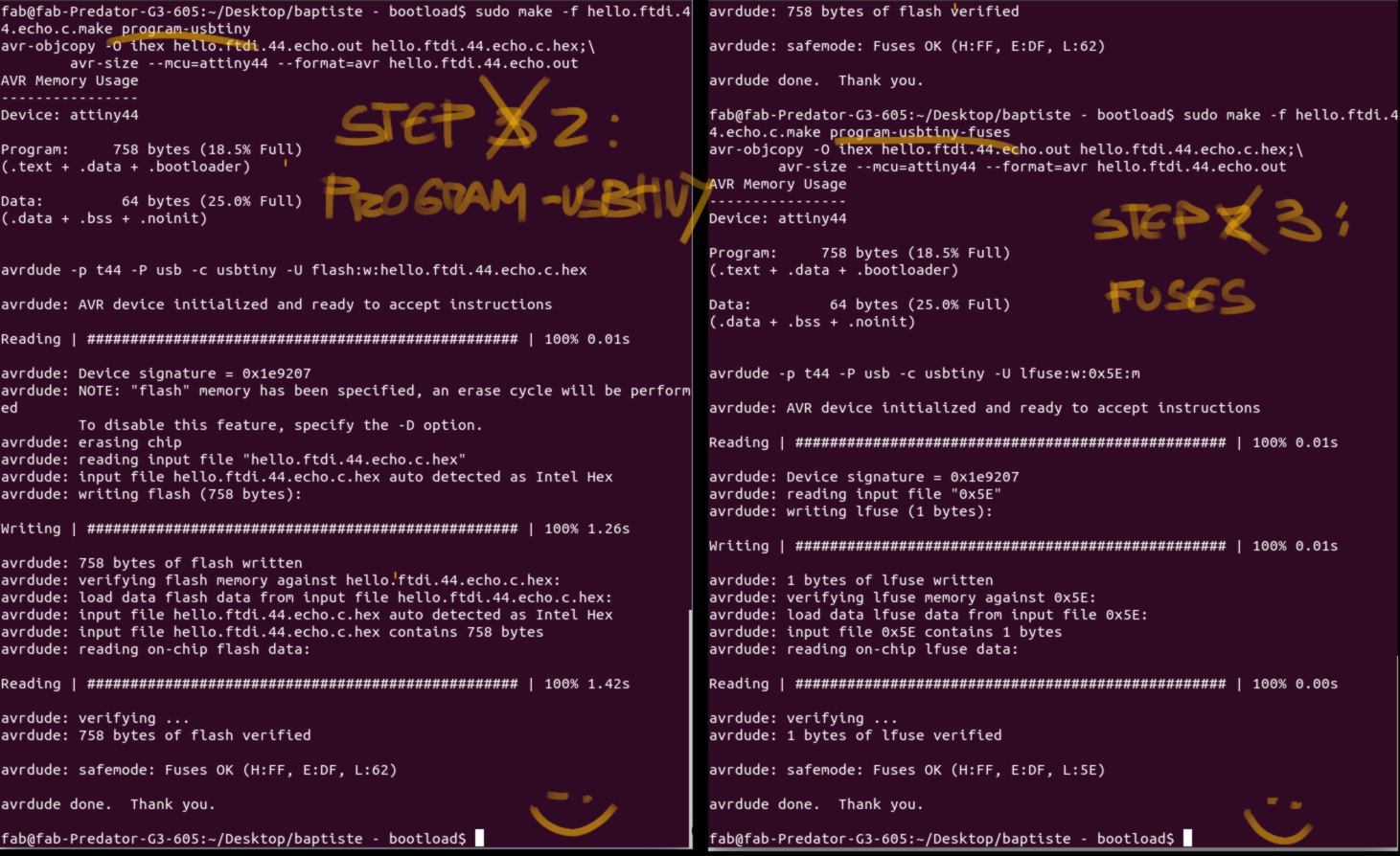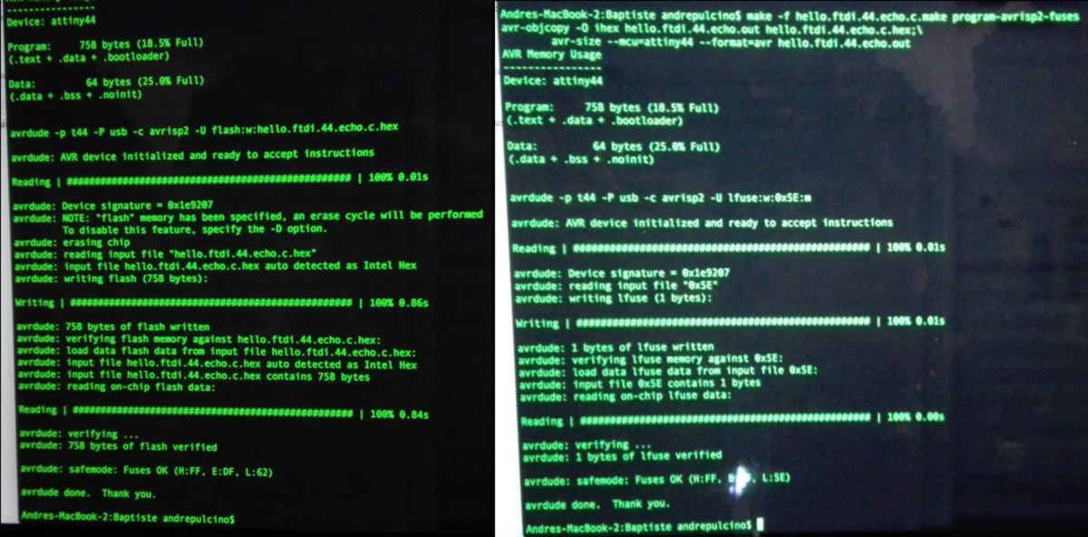 To verify that the problem comes from my board, I use another programer and repeat the process. This implies modifying the command lines slightly to trigger programs adapted to the new programer, here an avrisp2 :