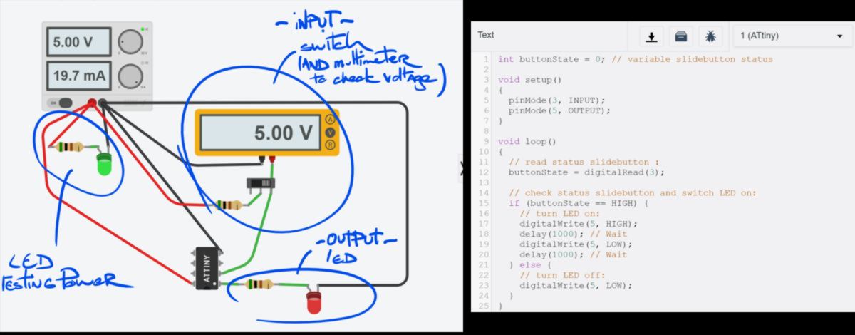 07.03.18 / I go to Tinkercad to simulate my board. I replicate part of the board using similar components, then write some code to make the LED blinks when the slideswitch is switched on :