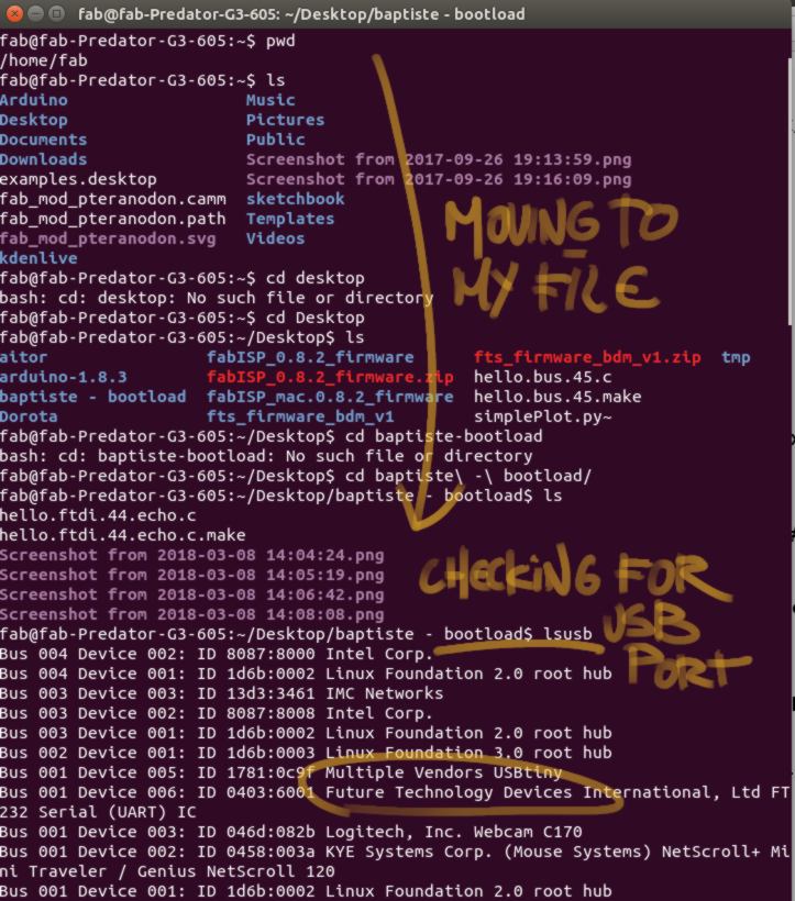 From the terminal, I position myself in the folder where the files have been downloaded and check that both the ISP programmer and my board are detected :
