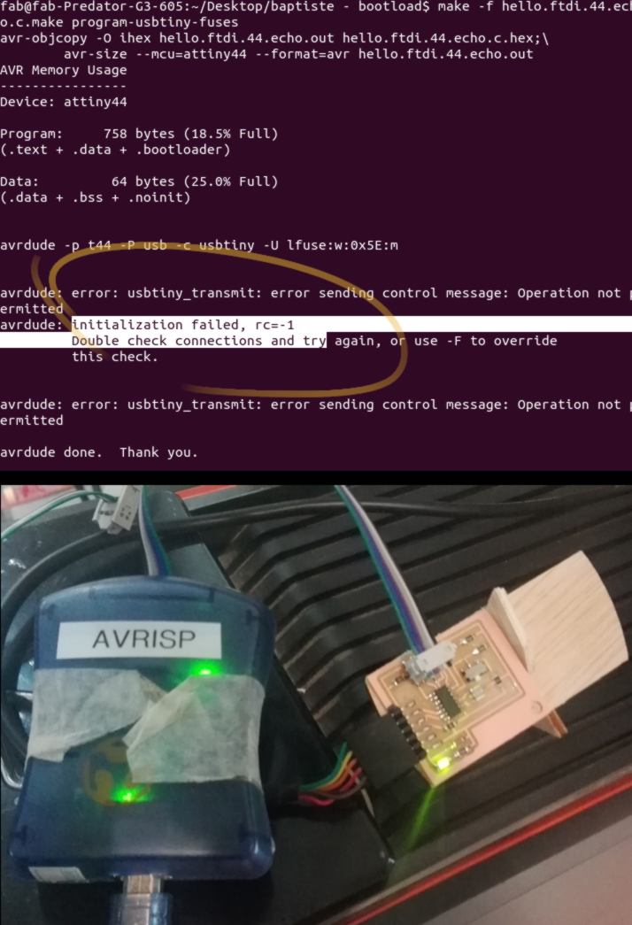 I go through the steps required. At the second step, I get an error message, warning me about an initialisation issue. To verify that my board is correctly wired, I connect the manufactured ISP programmer, which return a green - positive - feedback. The issue lies elsewhere.